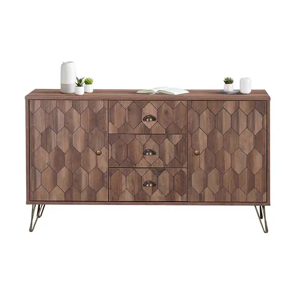 Елегантният шкаф от серия Федра разполага с две вратички за съхранение на принадлежности и три чекмеджета, разположени между тях. Изработен е от ПДЧ с меламиново покритие в цвят орех и метални детайли.