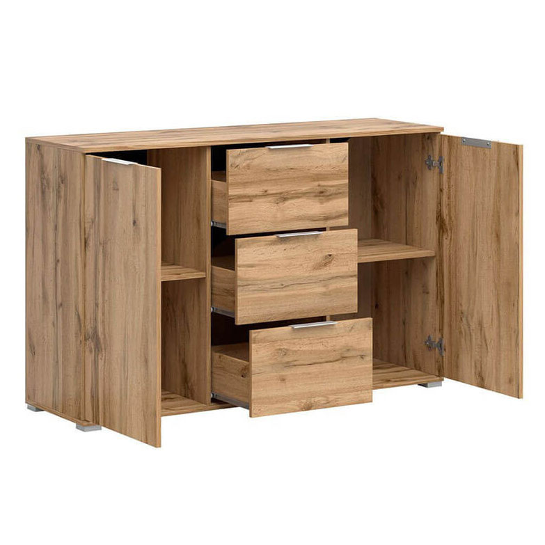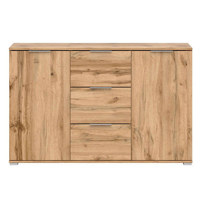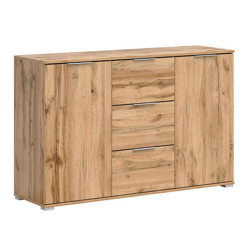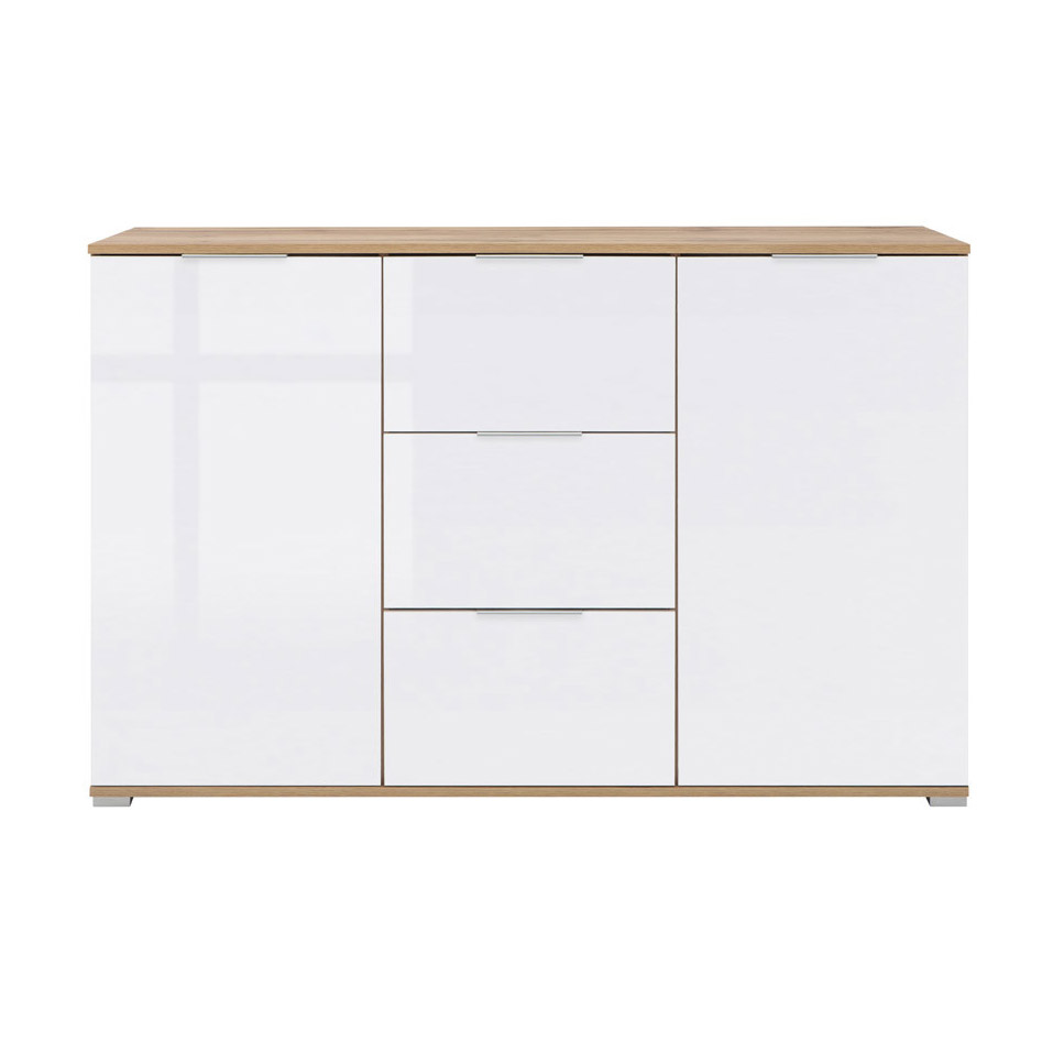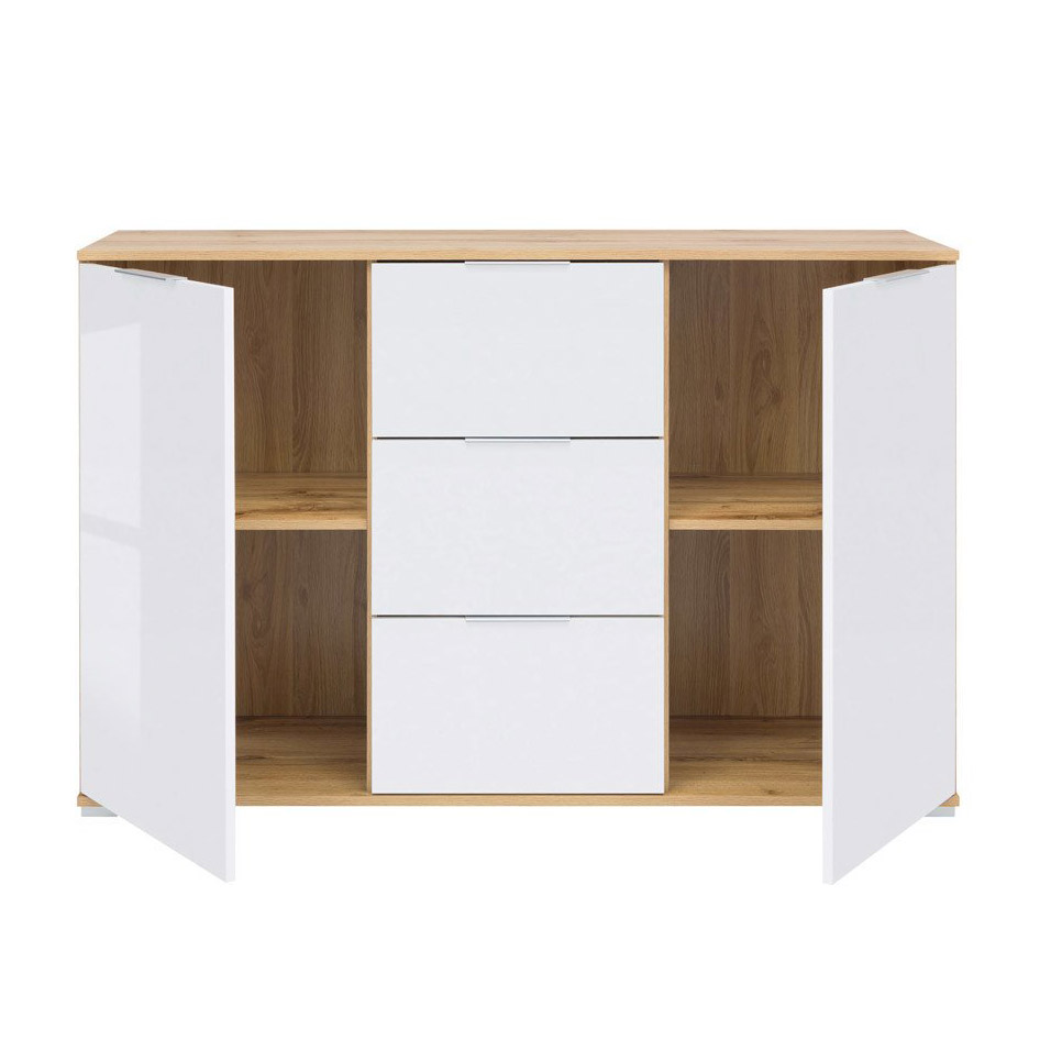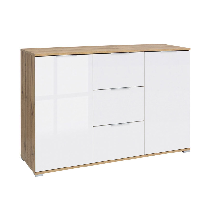 Шкаф, изработен от ПДЧ с меламиново покритие върху корпус в цвят дъб вотан, три чекмеджета и две вратички в бял гланц с елегантни дръжки и крачета, модулна система Зелле.