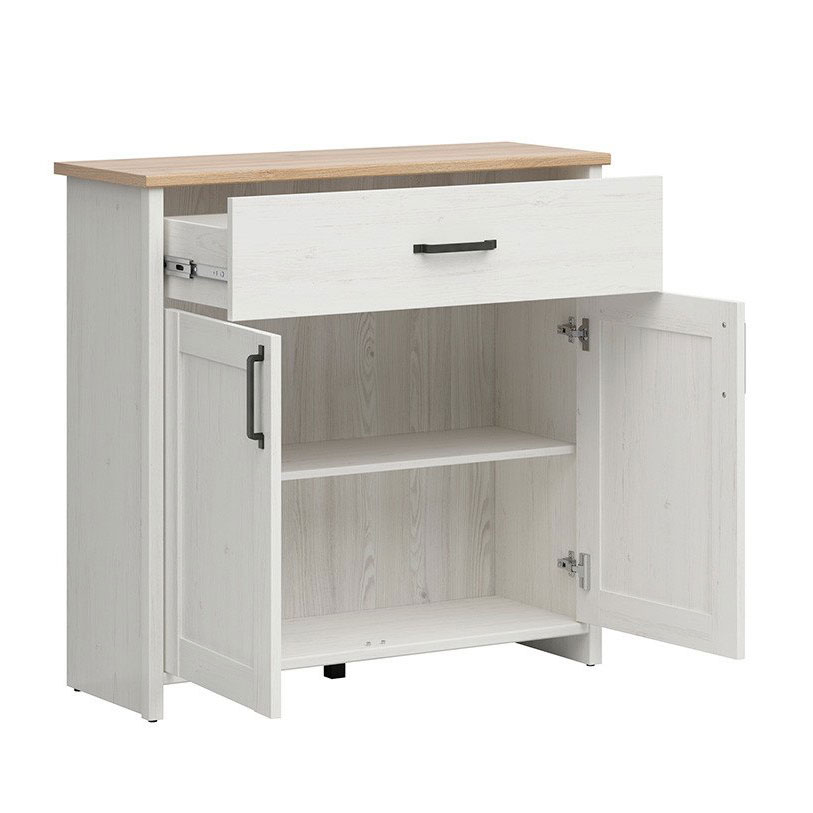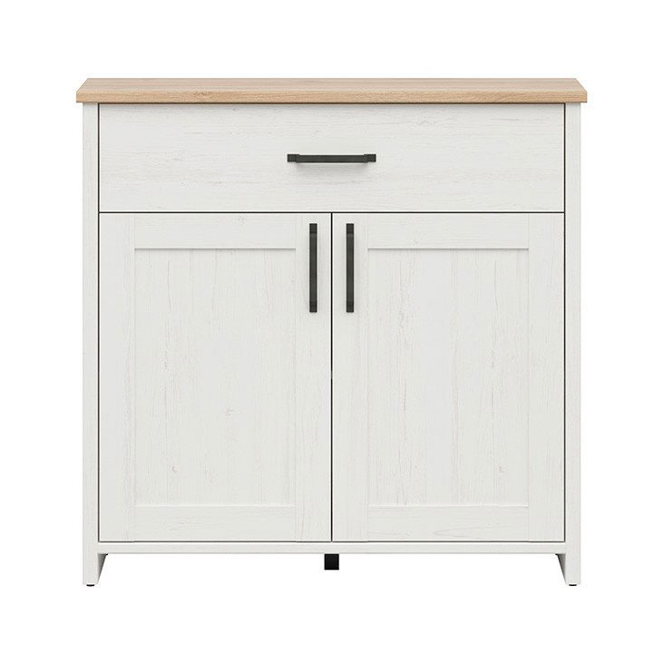 Шкаф, изработен от ПДЧ с две рамкирани вратички и чекмедже в цвят бял бор андерсън, плот в цвят дъб грандсон и черни метални дръжки, модулна система Локса.