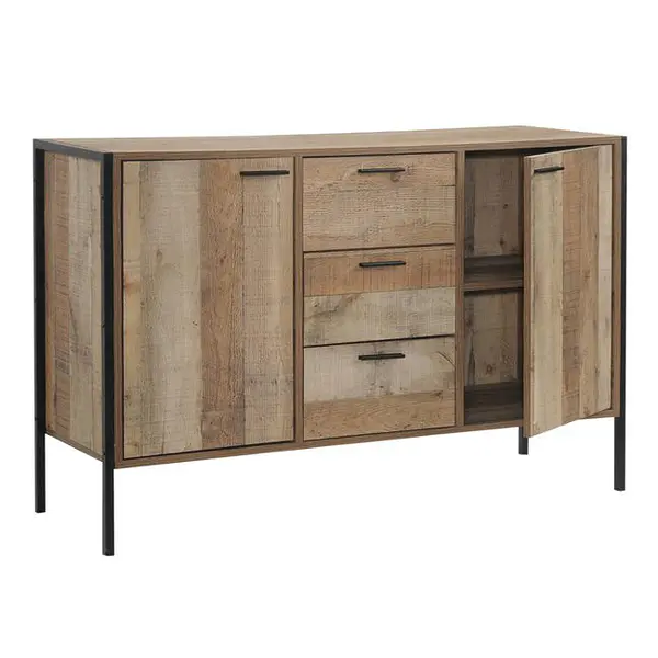 Шкаф с три чекмеджета и две вратички в индустриален стил, изработен от дървесина в цвят античен дъб с метална основа в черно, серия Пако.
