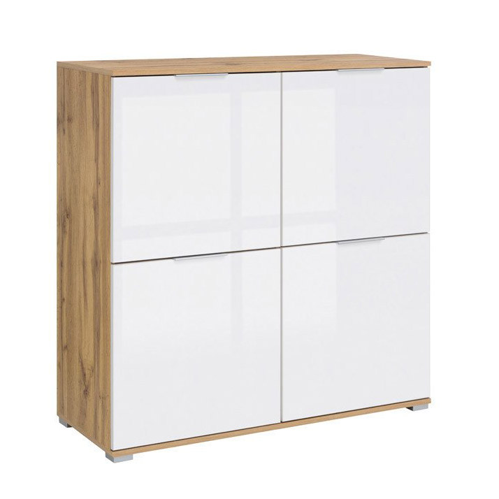 Шкаф от ПДЧ с меламиново покритие върху корпус в цвят дъб вотан и четири вратички в бял гланц с елегантни дръжки и крачета, модулна система Зелле.