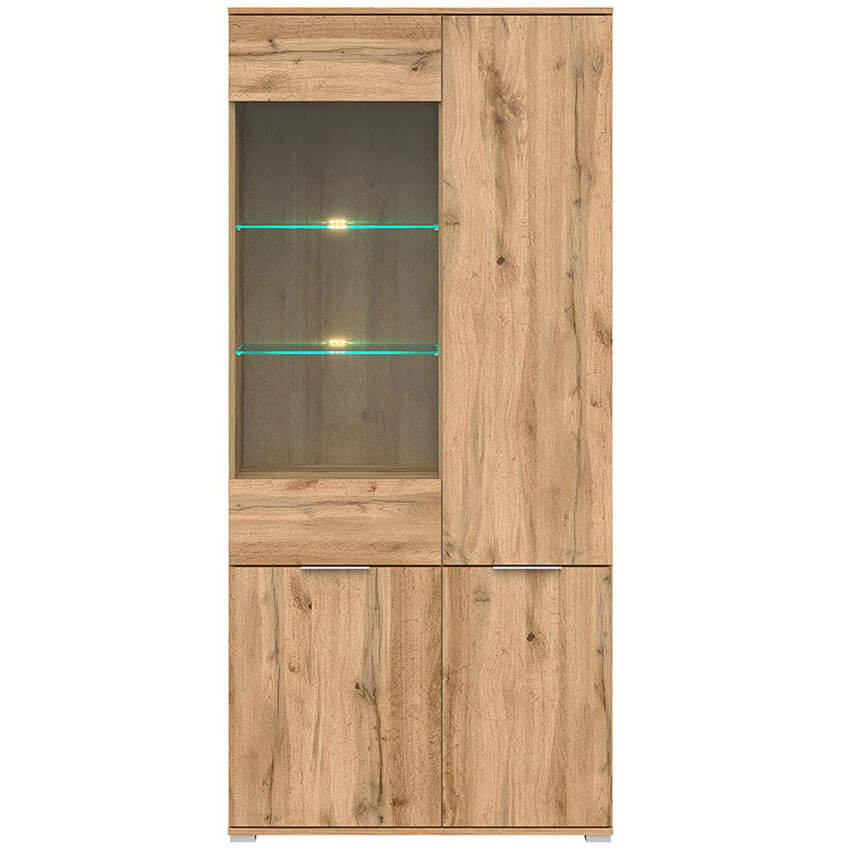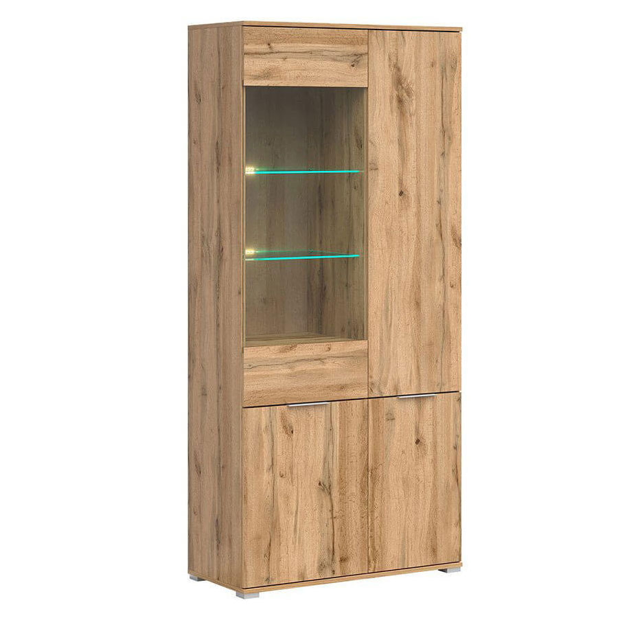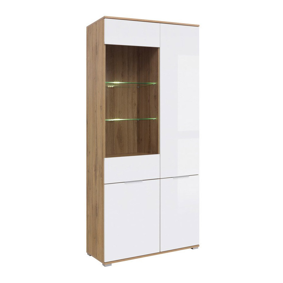 Висок шкаф с корпус в цвят дъб вотан, изработен от ПДЧ с четири бели гланцирани врати и витрина от закалено стъкло с възможност за вграждане на LED осветление, модулна система Зелле.