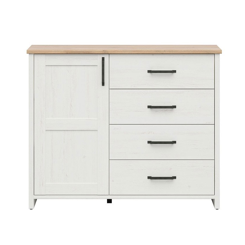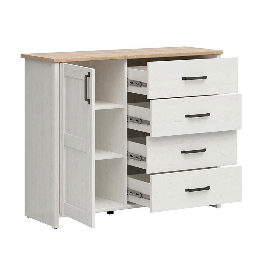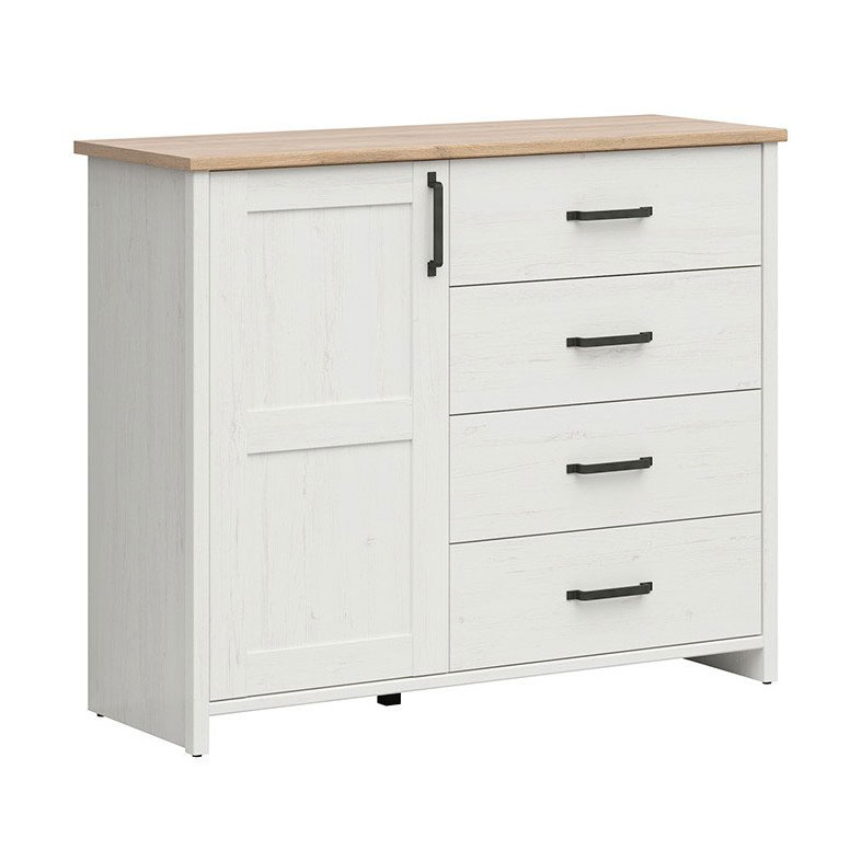 Шкаф, изработен от ПДЧ с корпус в цвят бял бор андерсън и плот в цвят дъб грандсон, четири чекмеджета и рамкирана вратичка с черни метални дръжки, модулна система Локса.