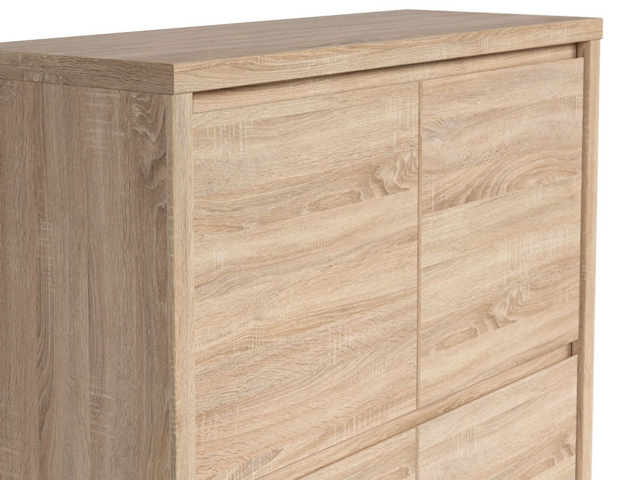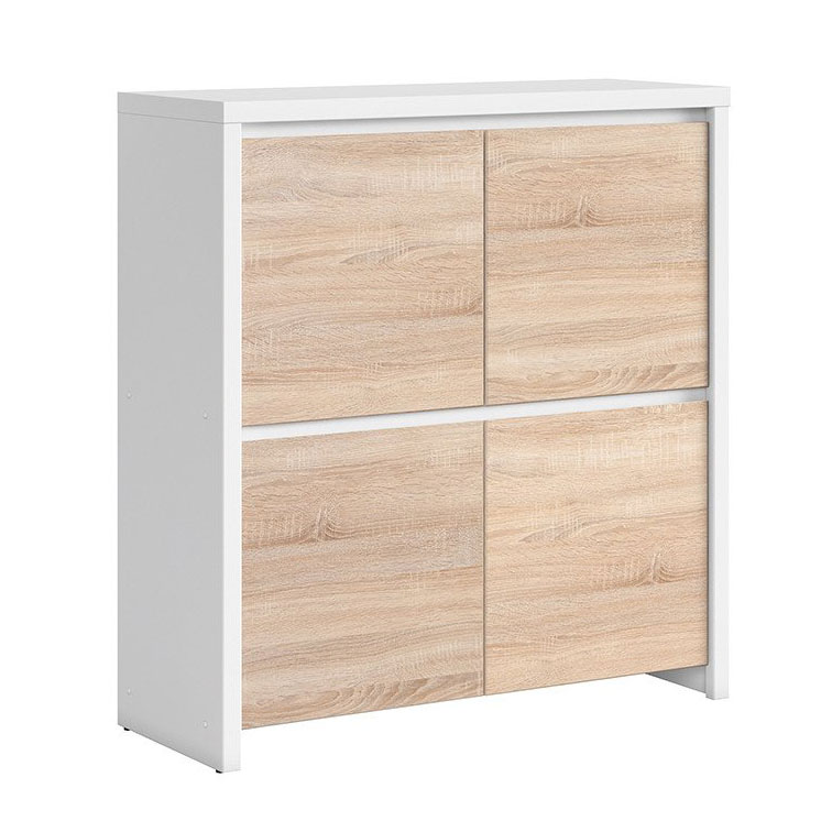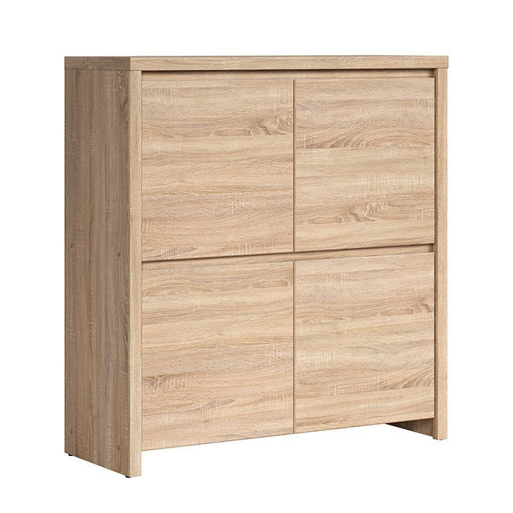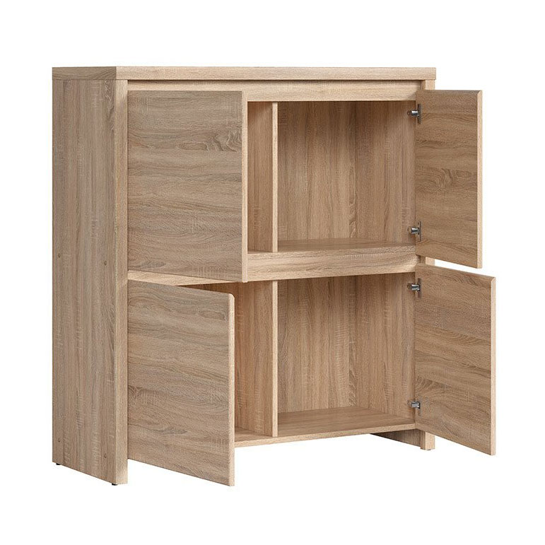 Функционален шкаф от ПДЧ с четири вратички от модулната система Каспиан Дъб, предлагащ се в три варианта – дъб сонома, бял корпус с лицева част в дъб сонома, корпус в дъб сонома с лицева част в бял гланц.