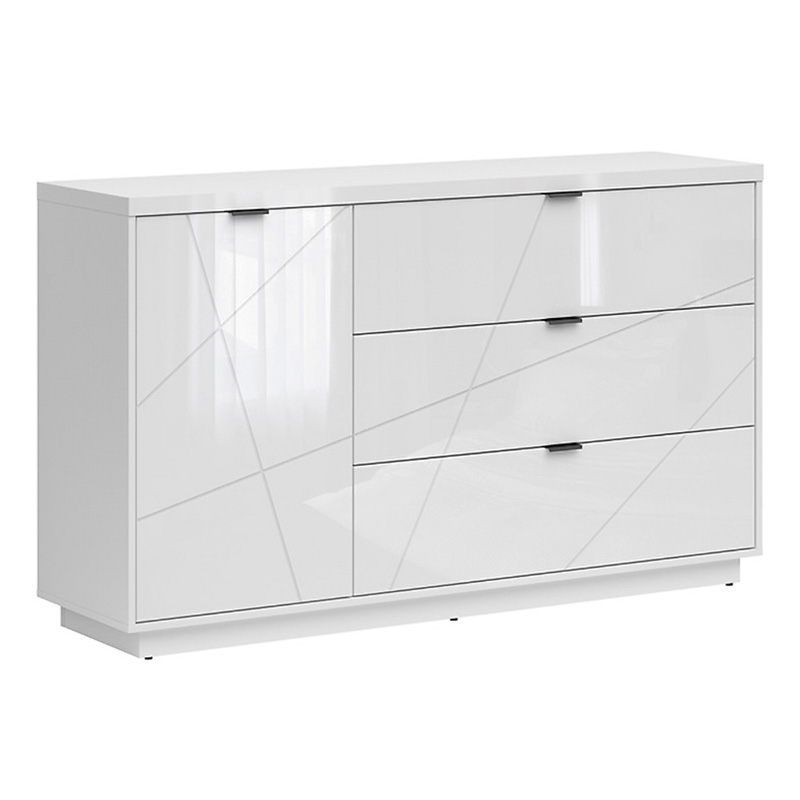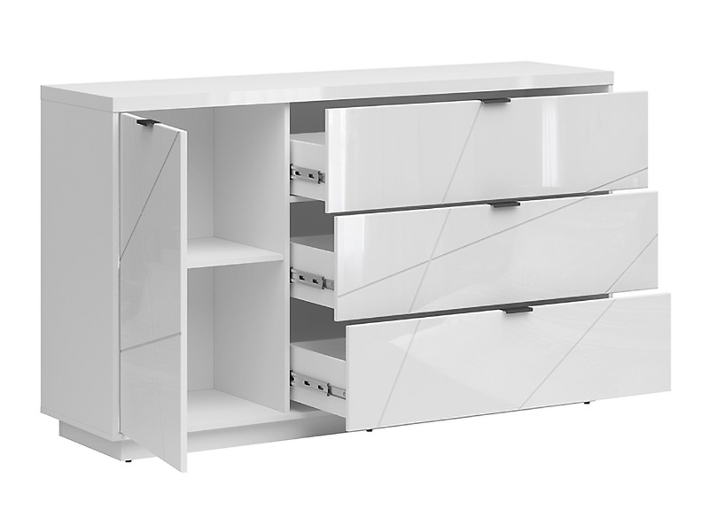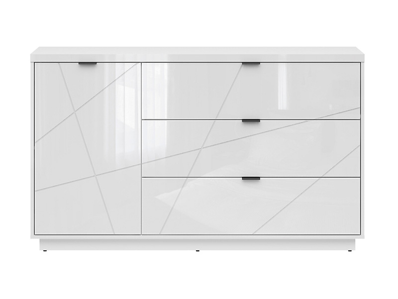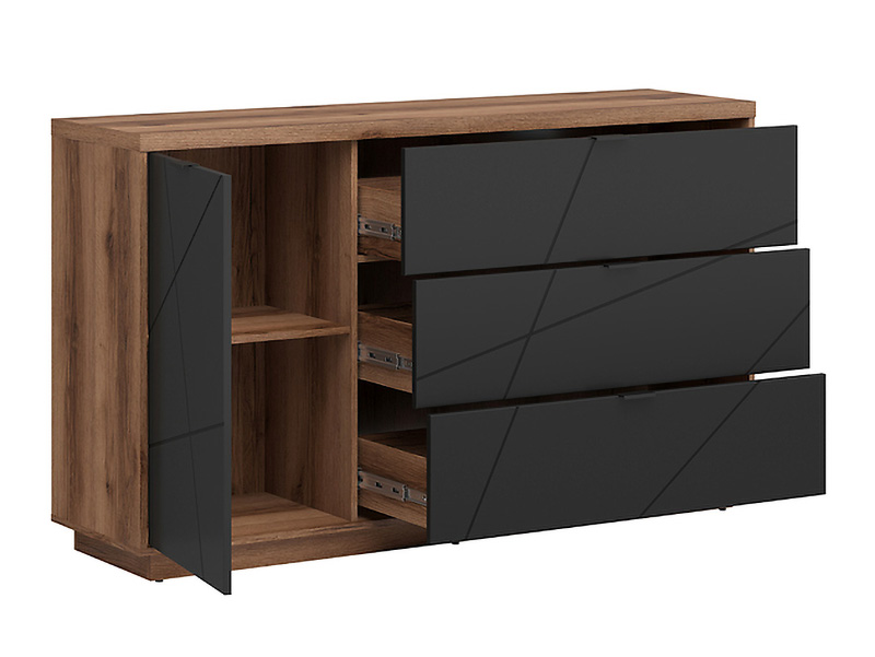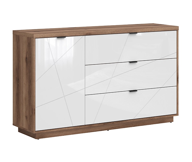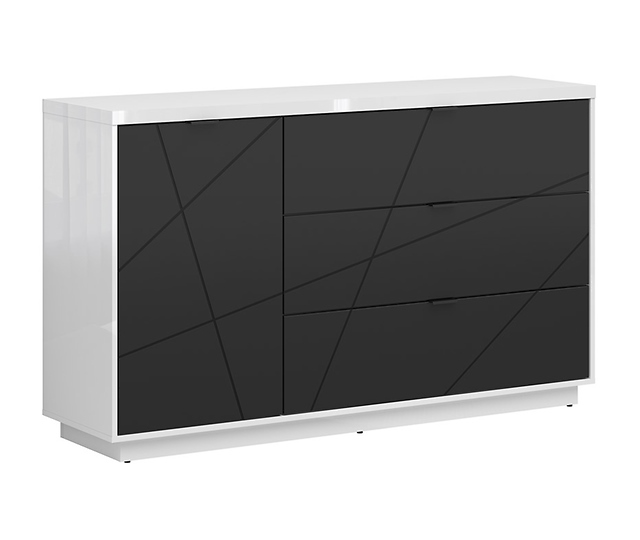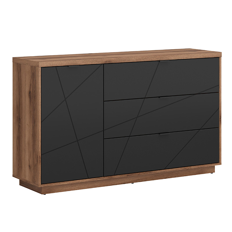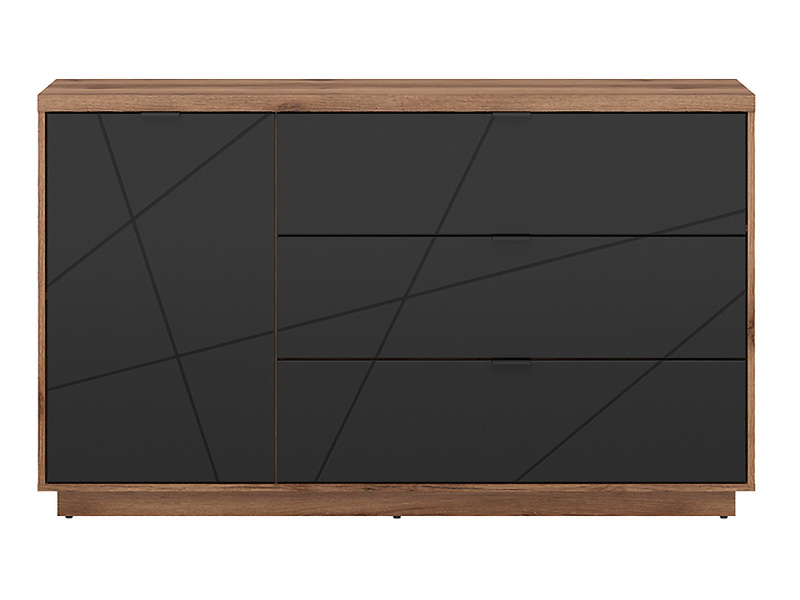 Нисък шкаф, изработен от ПДЧ с три чекмеджета и вратичка с геометрична декорация тип линейна фрезовка, модулна система Форн.