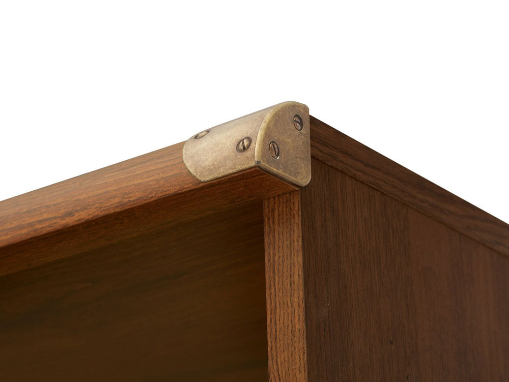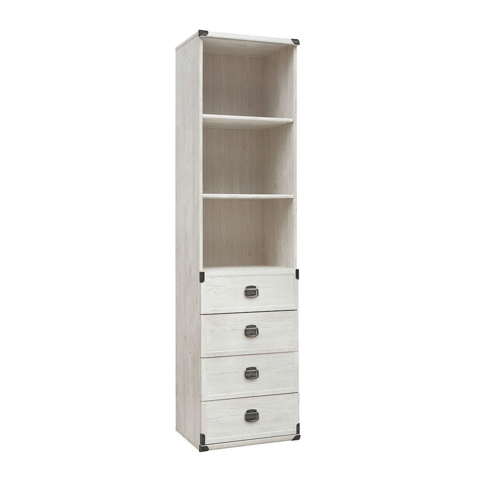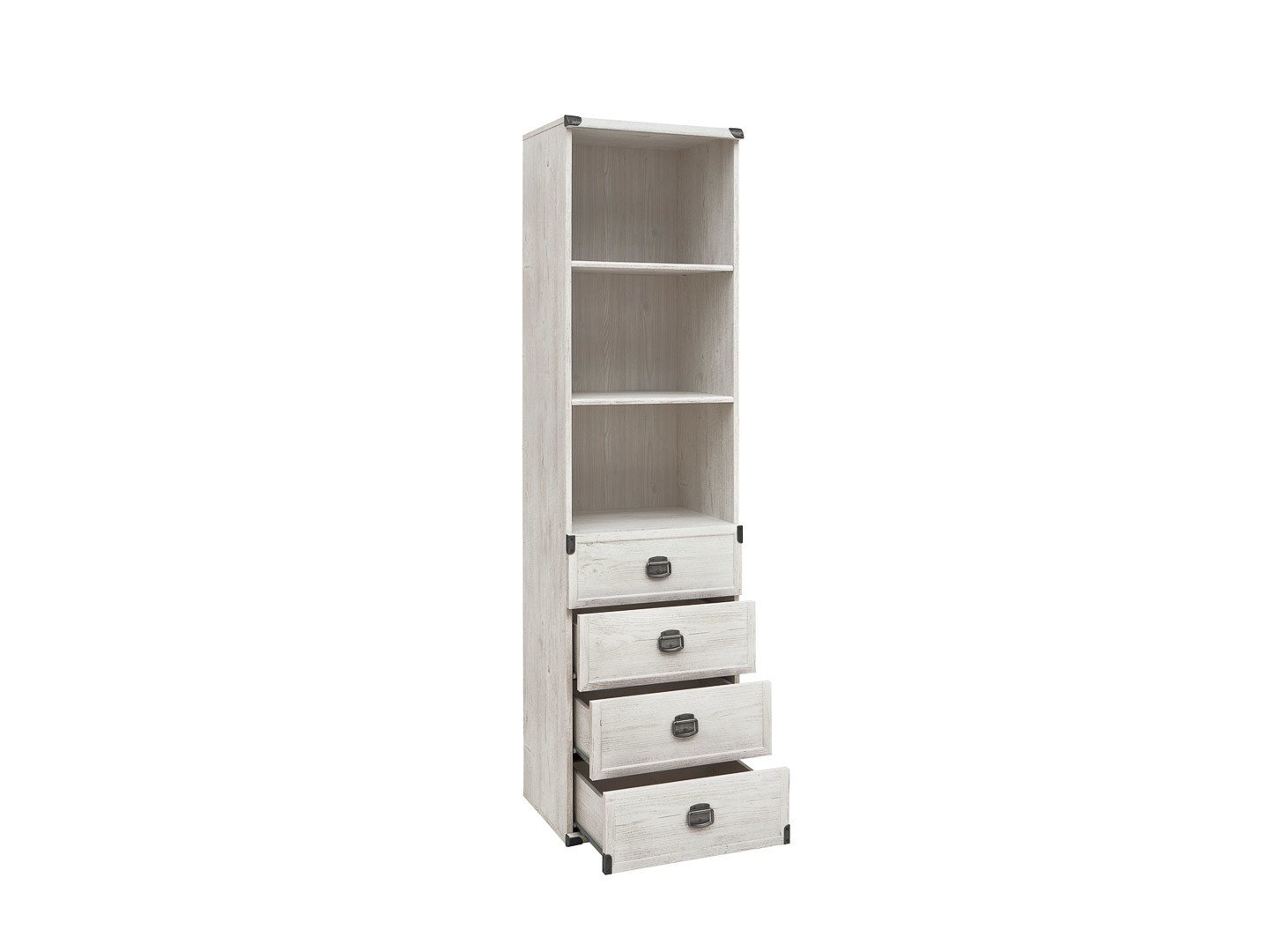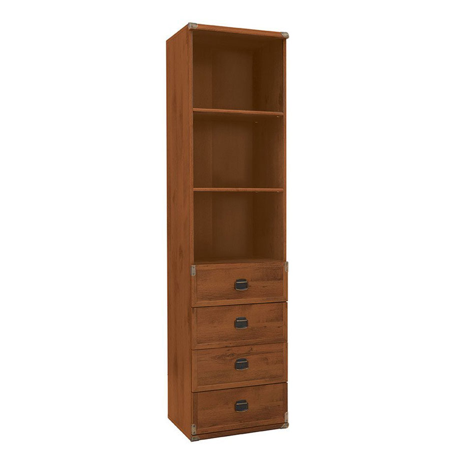 Висок шкаф с три открити рафта и четири чекмеджета със старинни метални дръжки и облицовани ъгли, модулна система Индиана. Предлага се в два дървесни цвята – дъб сутер и бор каньон.