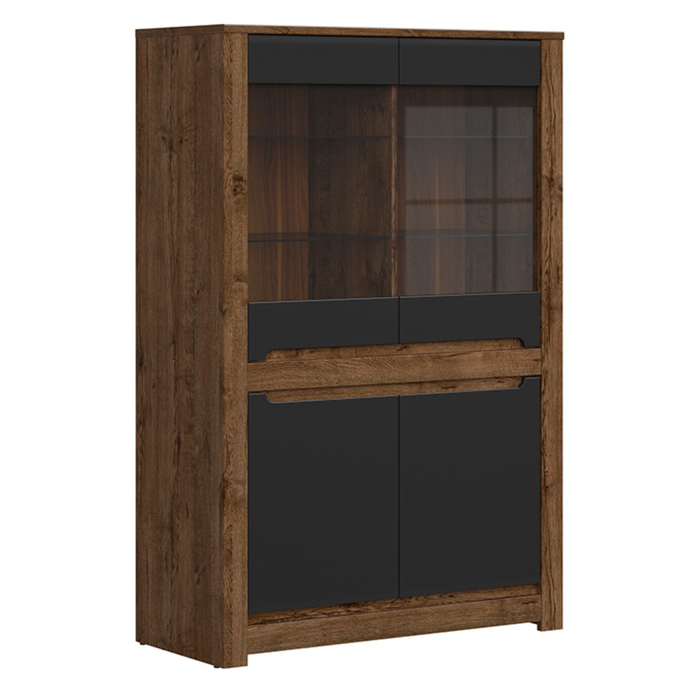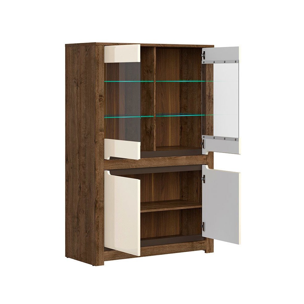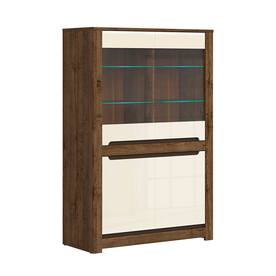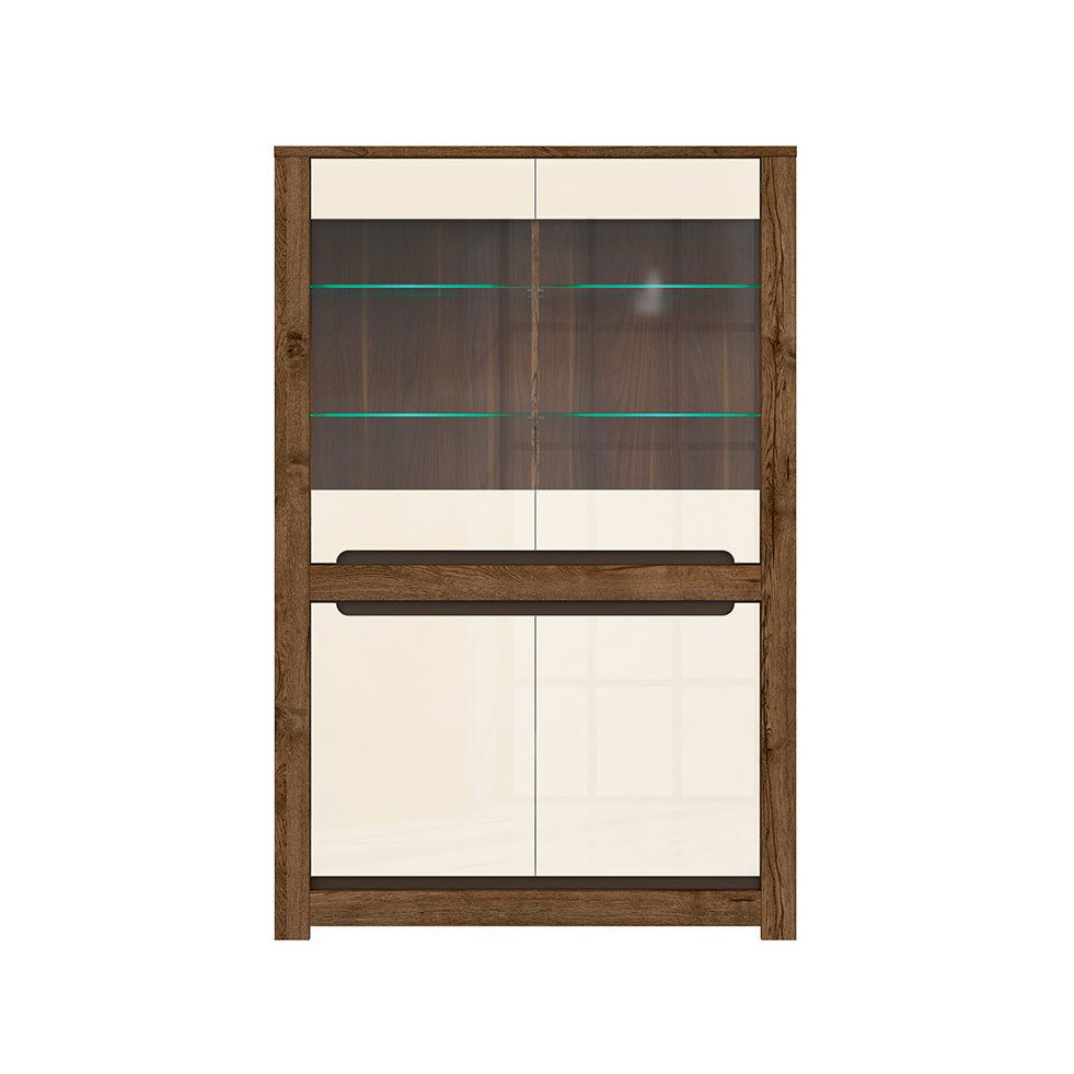 Шкаф витрина, изработен от ПДЧ и МДФ с корпус в цвят дъб април, четири вратички в перлен гланц екрю или черен мат, стъкло, и възможност за вграждане на LED осветление, модулна система Русо.