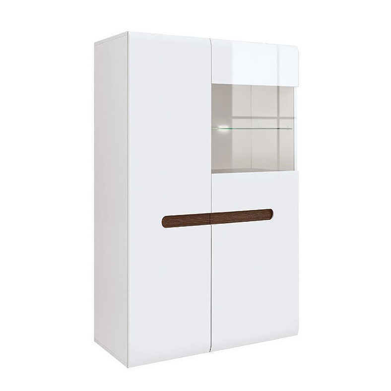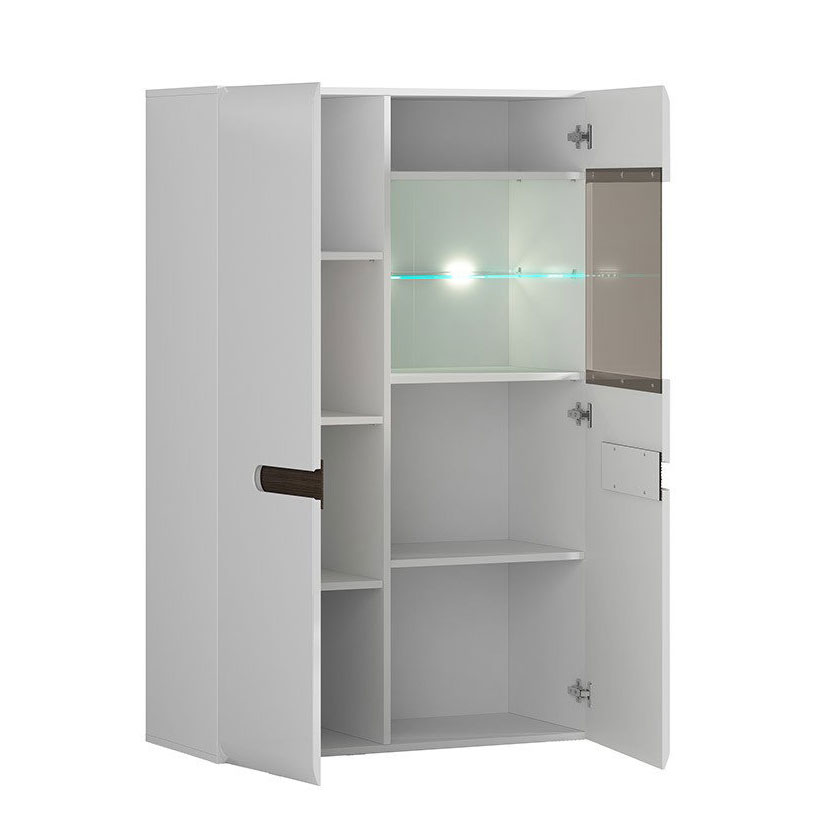 Модерен шкаф от ПДЧ и МДФ със стъклена витрина с вградено LED осветление и вратичка, модулна система Ацтека. Предлага се с две декоративни ленти – двустранна (бял или черен гланц) и едностранна в цвят венге.