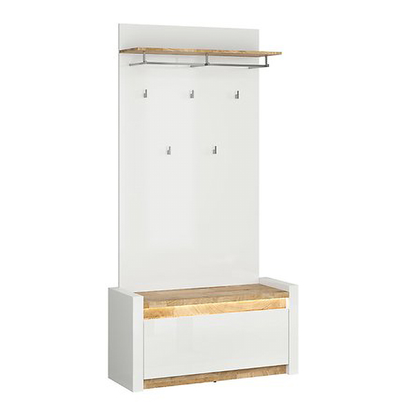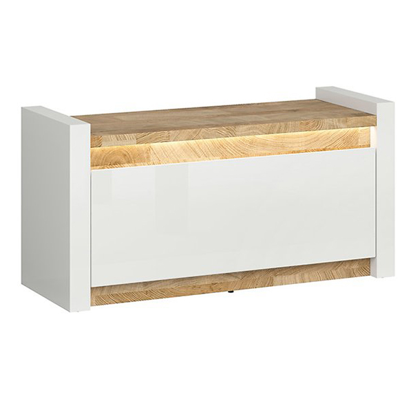 Шкаф за обувки, изработен от МДФ и ПДЧ в бял гланц и уестминстърски дъб с падаща вратичка и вградено LED осветление, модулна система Аламеда.