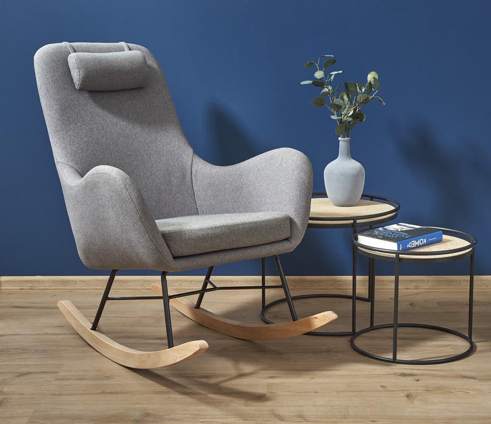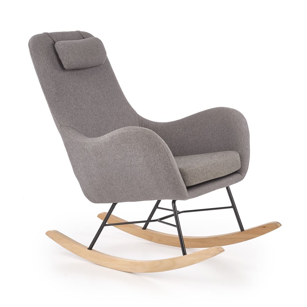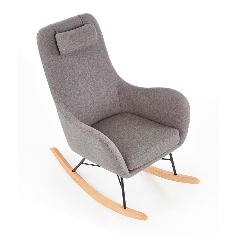 Сив люлеещ се стол с дървена основа и текстилна дамаска.