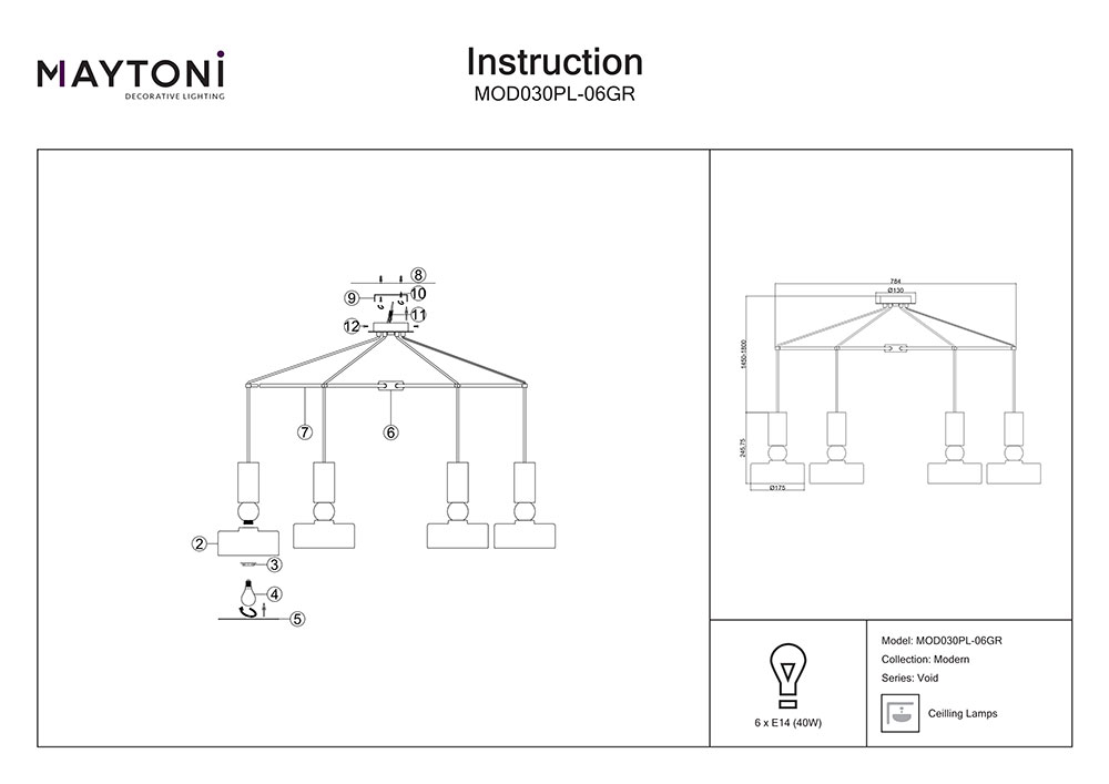 Сив пендел, изработен от метал и акрил с шест тела и модерен дизайн Maytoni, серия Void.