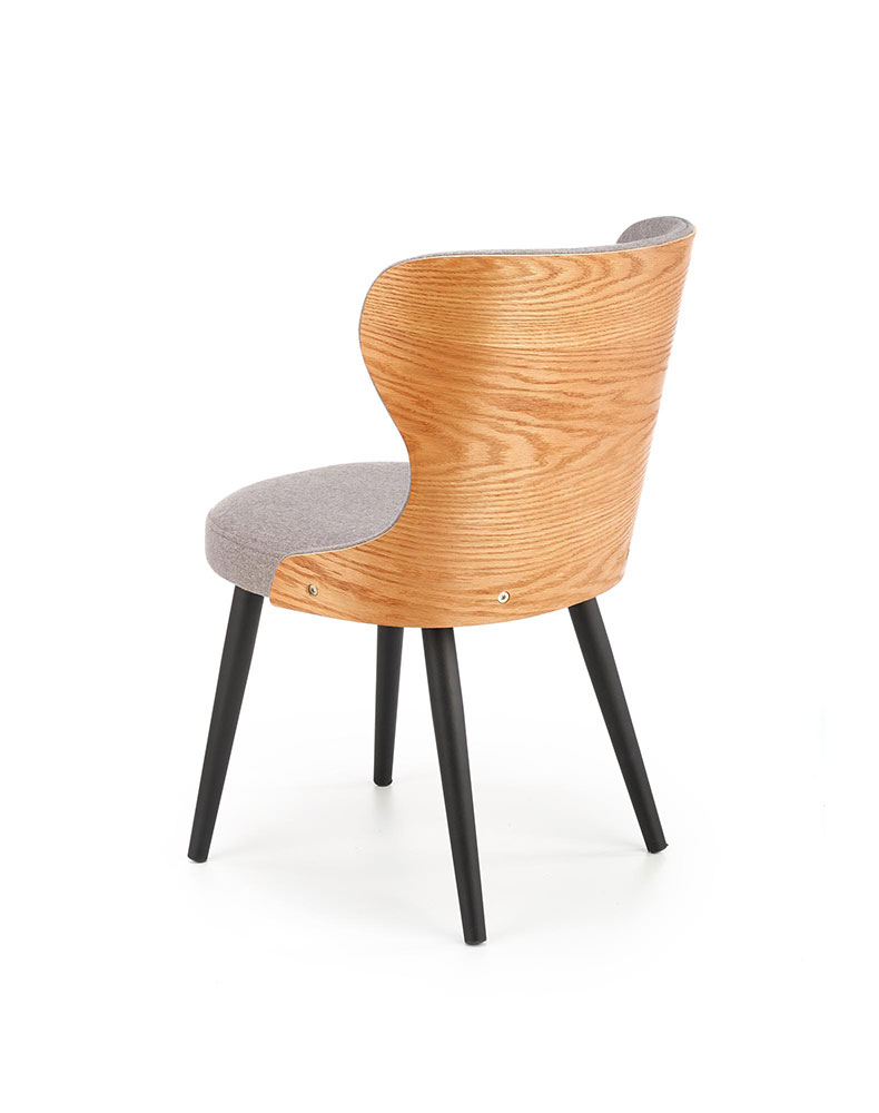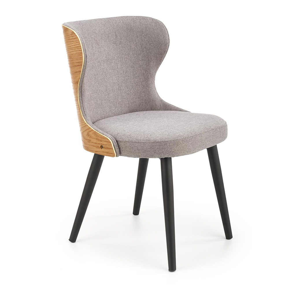Сив трапезен стол с текстилна дамаска и гръб в дървесен цвят натурален дъб върху черни метални крака.