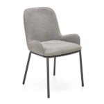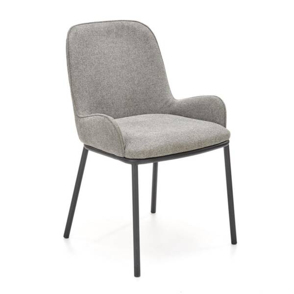 Сив трапезен стол, изработен с текстилна дамаска и метални крака в черен цвят.
