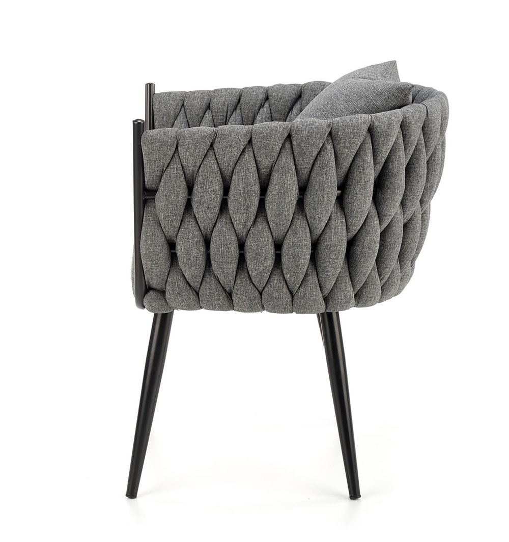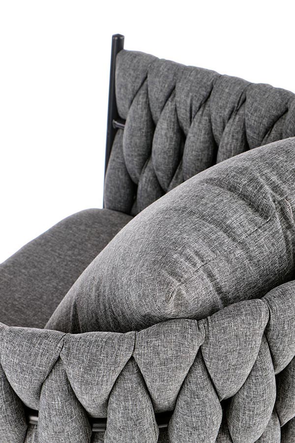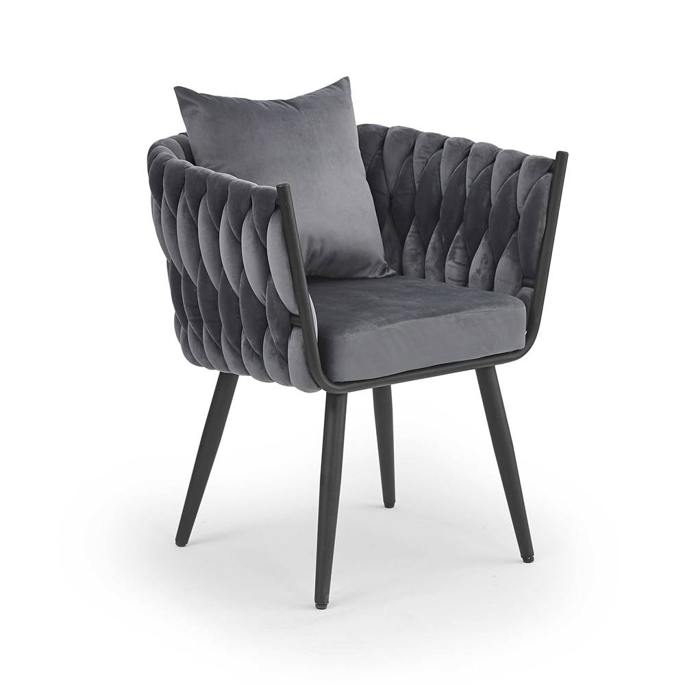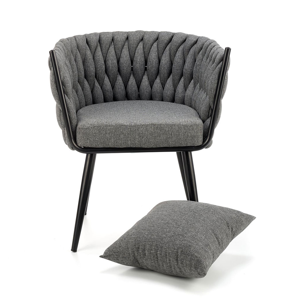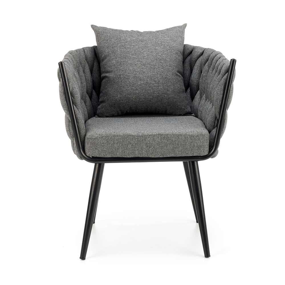 Сиво кресло, изработено от текстил с преплетена облегалка и подлакътници, възглавничка и метална основа в черен цвят.