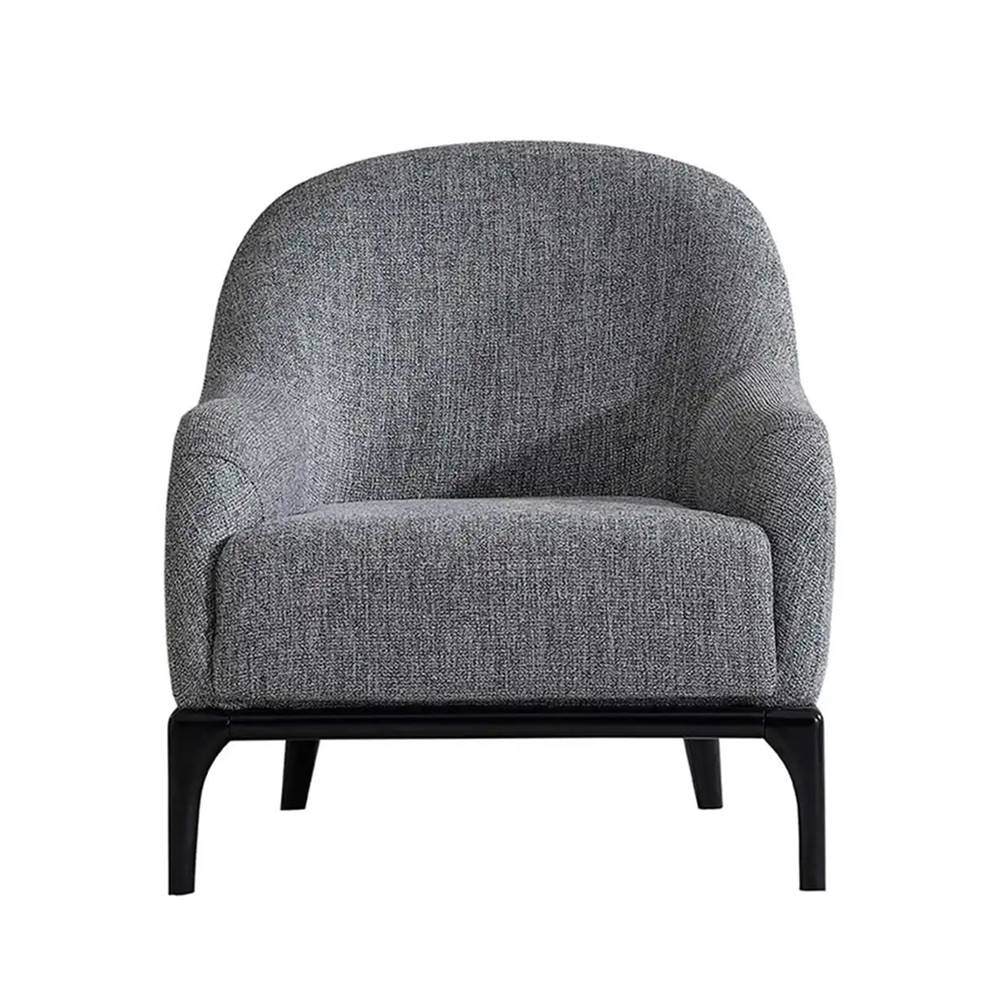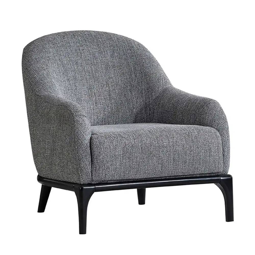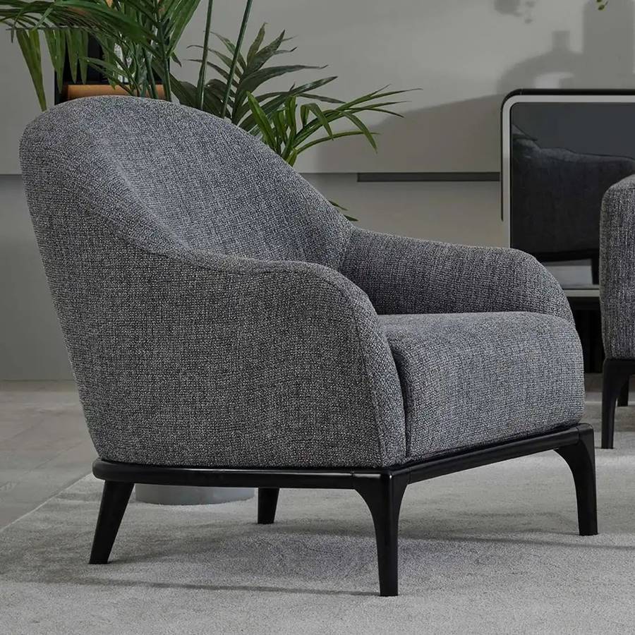 Елегантно сиво кресло с овална облегалка и крачета в черно, което съчетава стил и комфорт по перфектен начин.