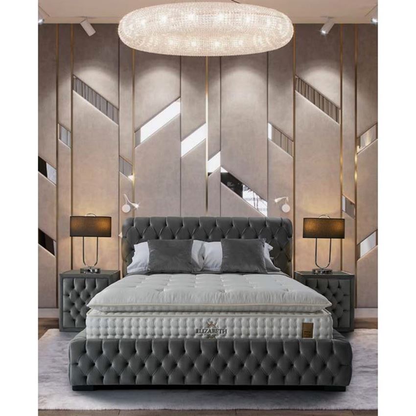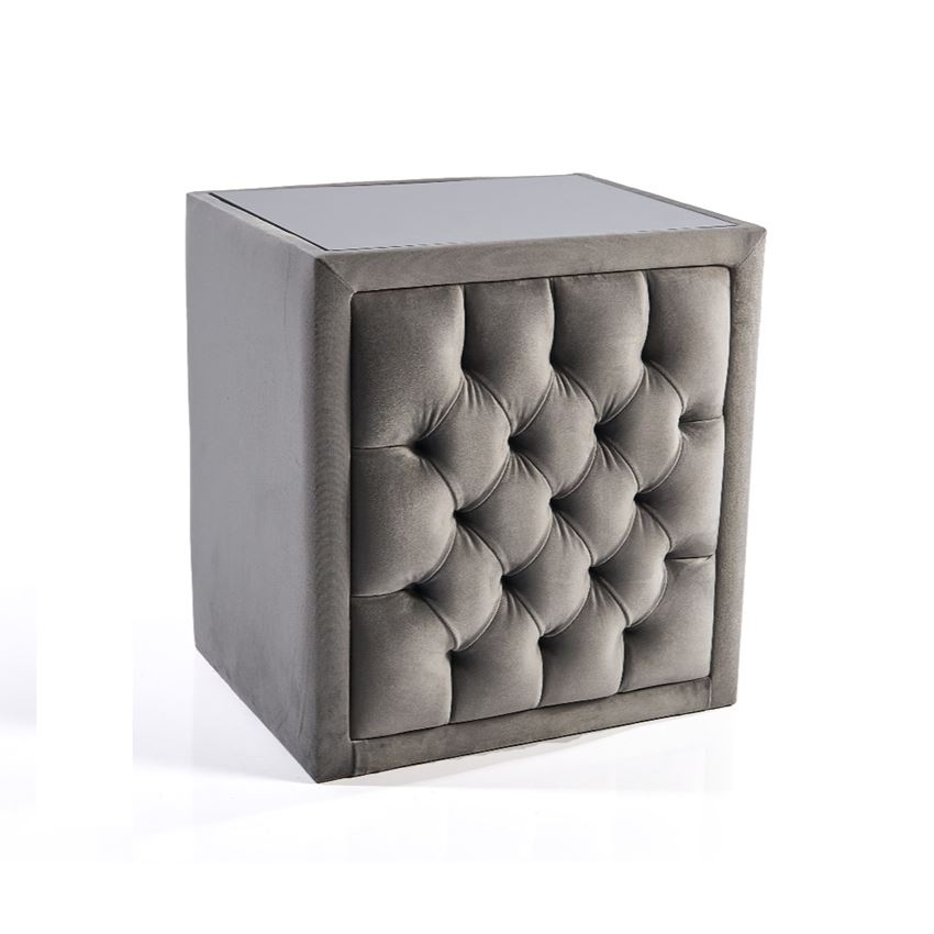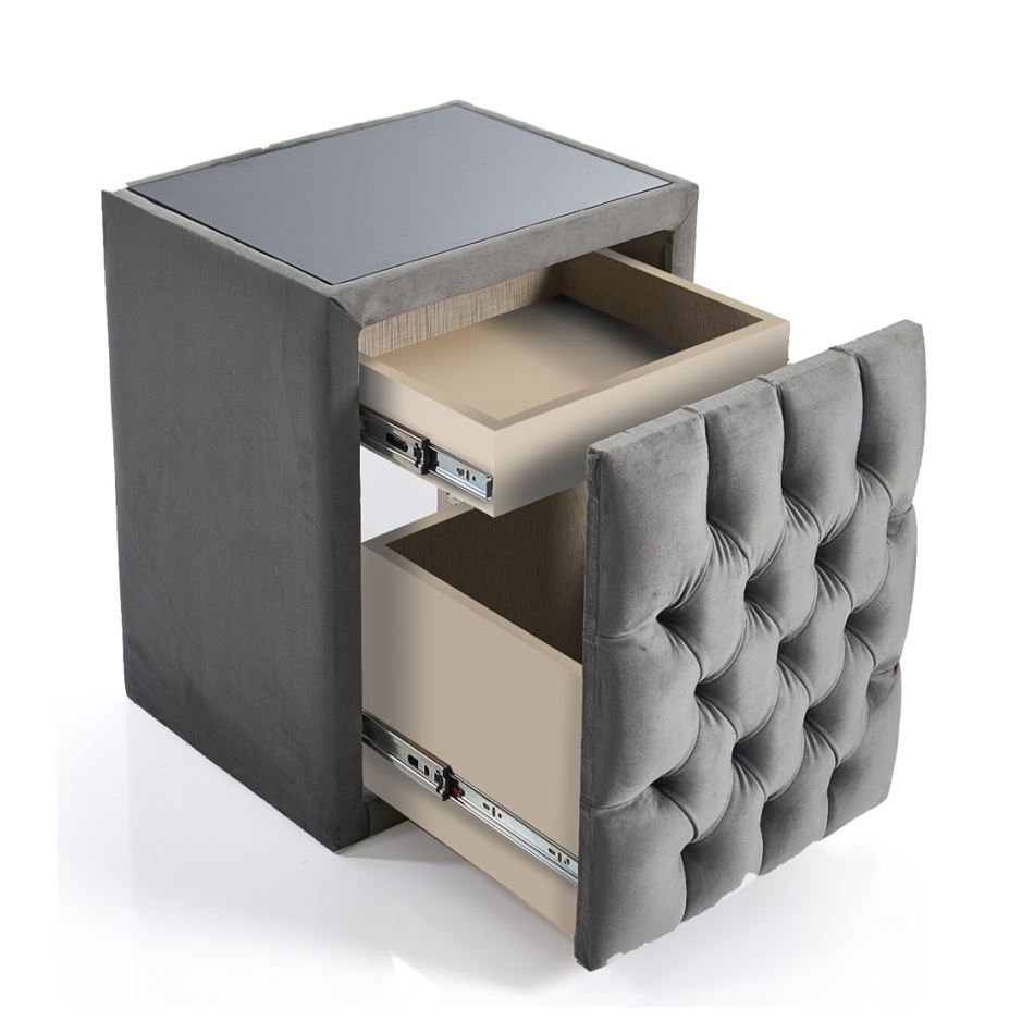 Сиво нощно шкафче с атрактивен капитониран фронт и две чекмеджета.