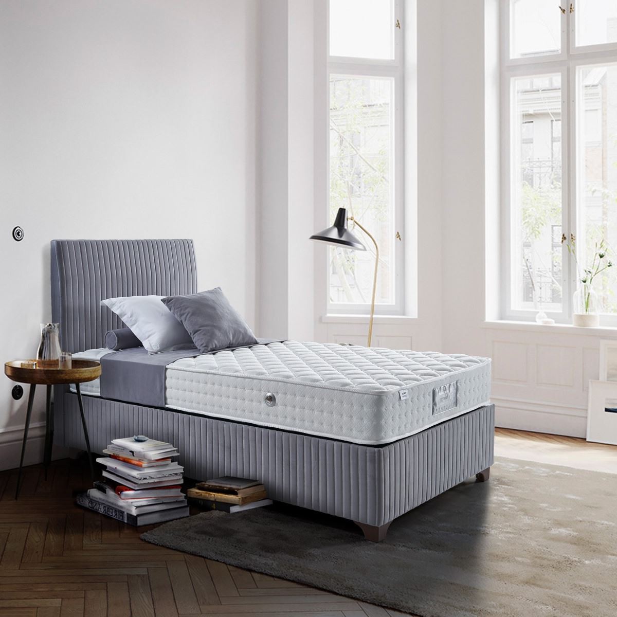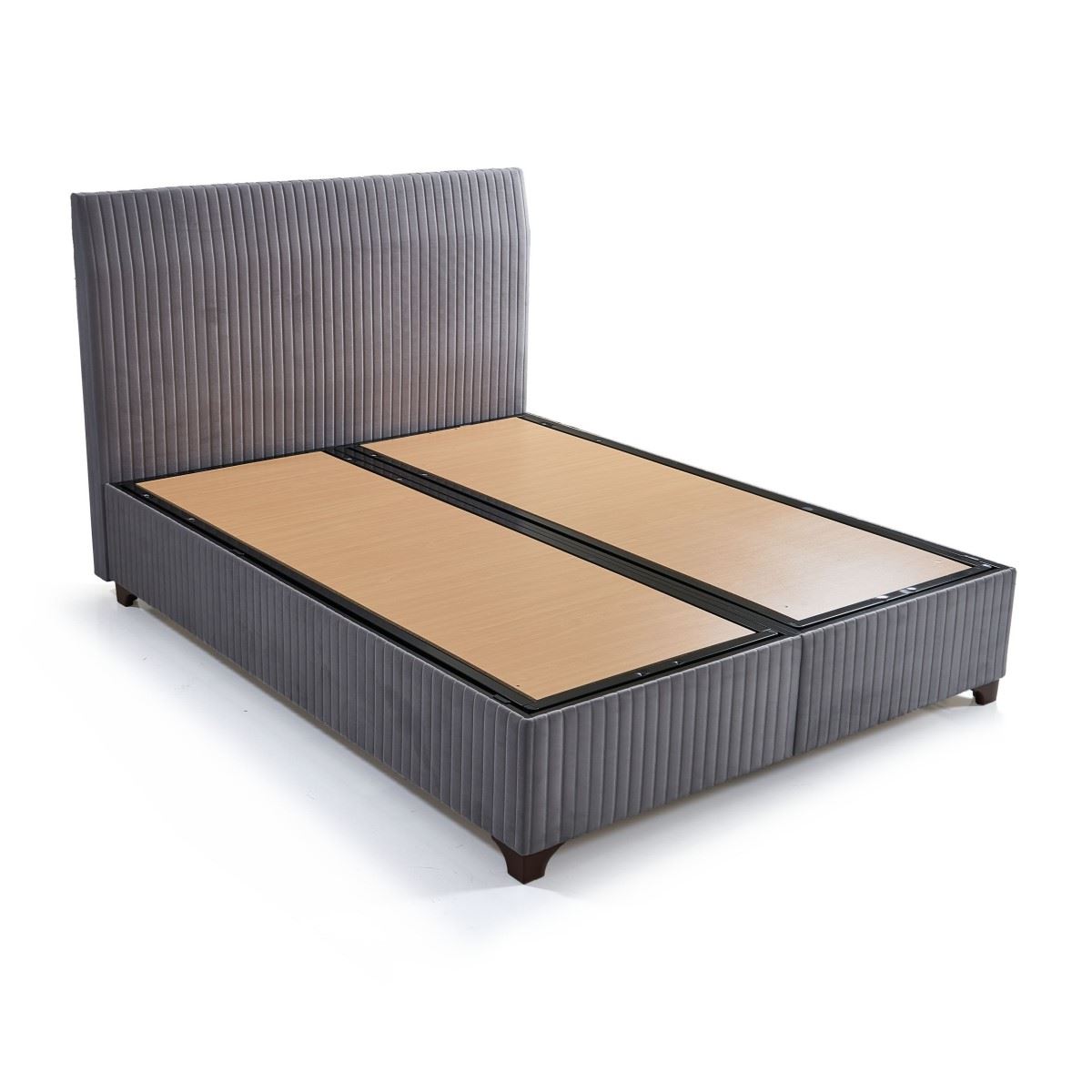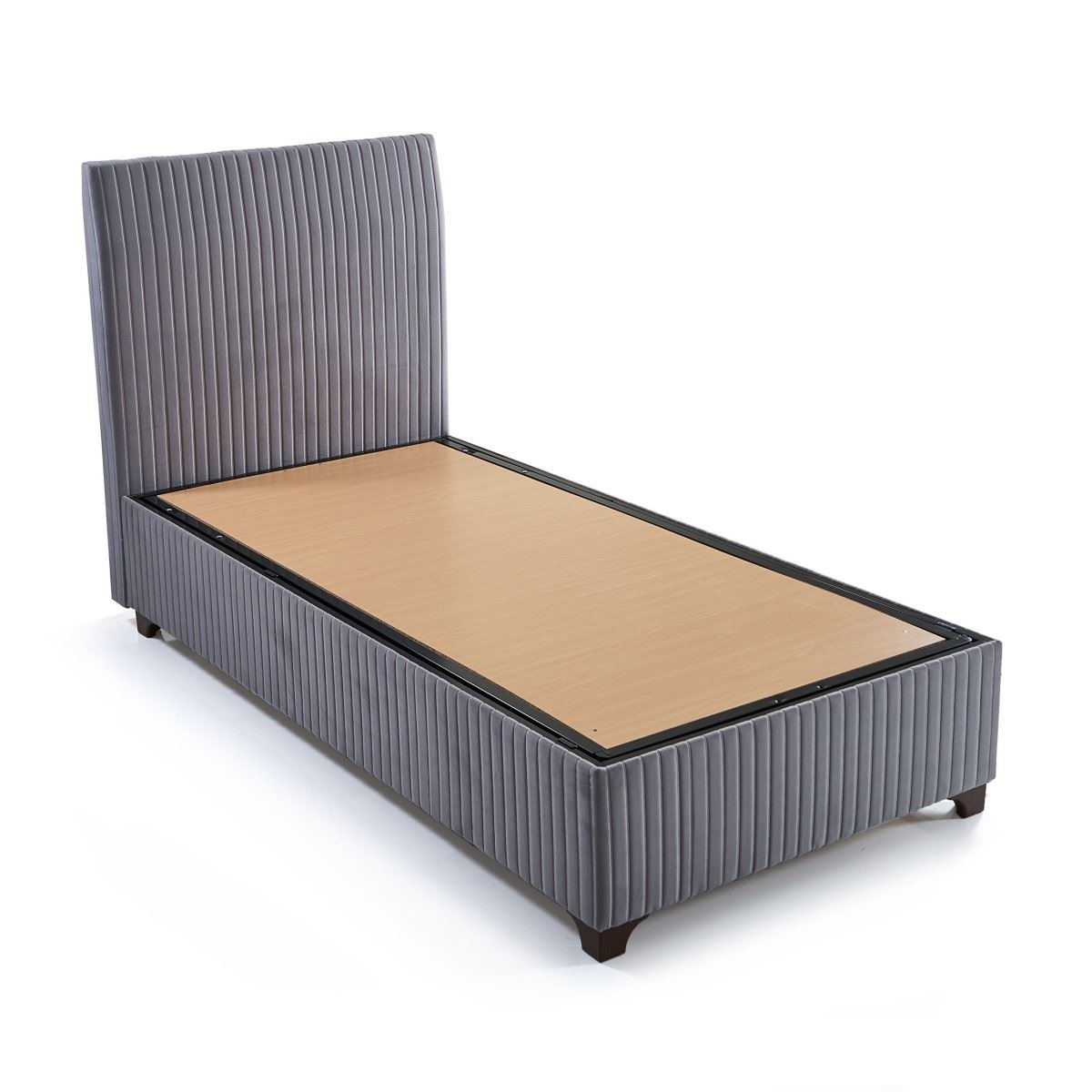 Сиво тапицирано легло с табла на вертикални линии-единична база, интериор