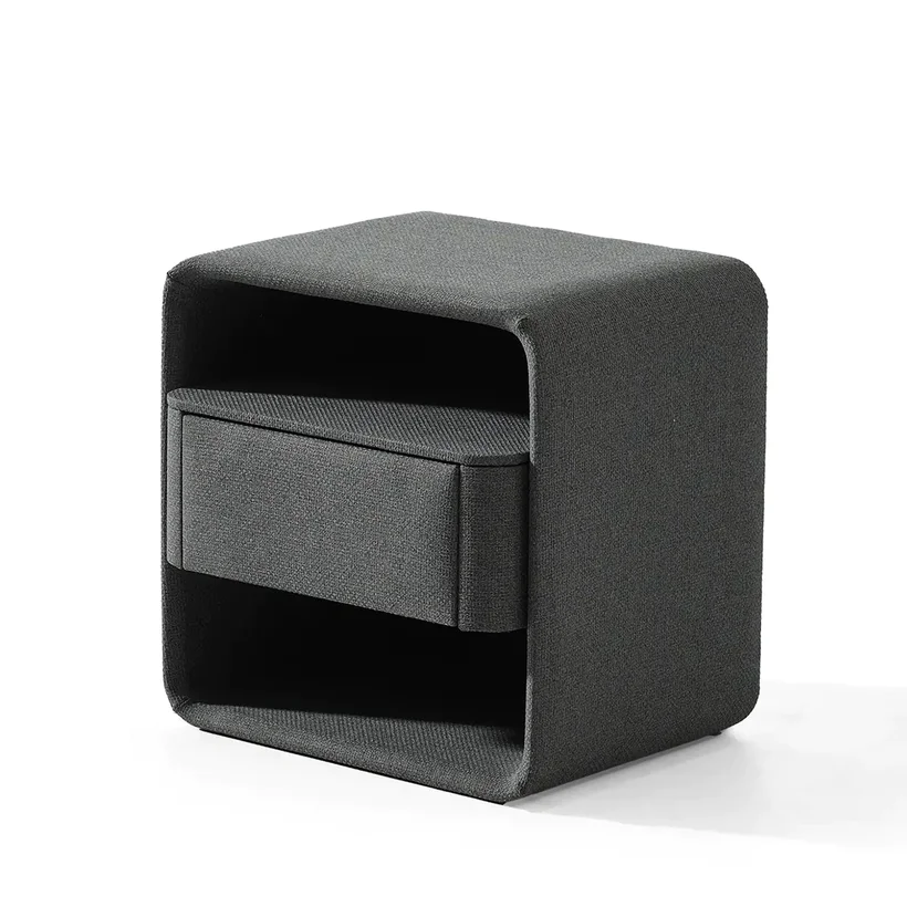 Сиво тапицирано нощно шкафче с чекмедже, съчетаващо модерен дизайн и функционалност.