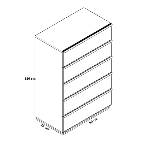 Практичен скрин с пет чекмеджета за съхранение на лични принадлежности, изработен МДФ, ПДЧ и закалено стъкло на лицевата част, серия Оливия.