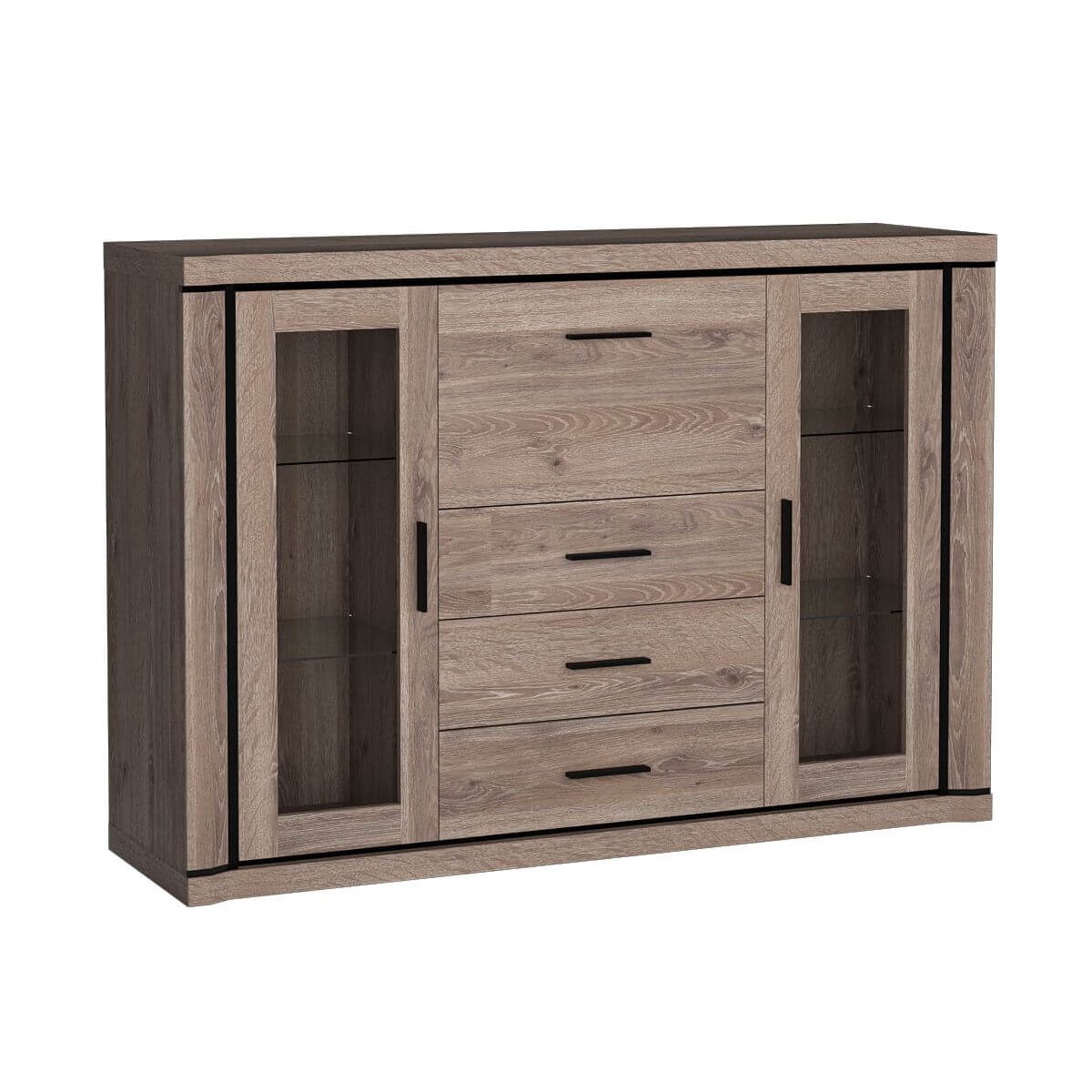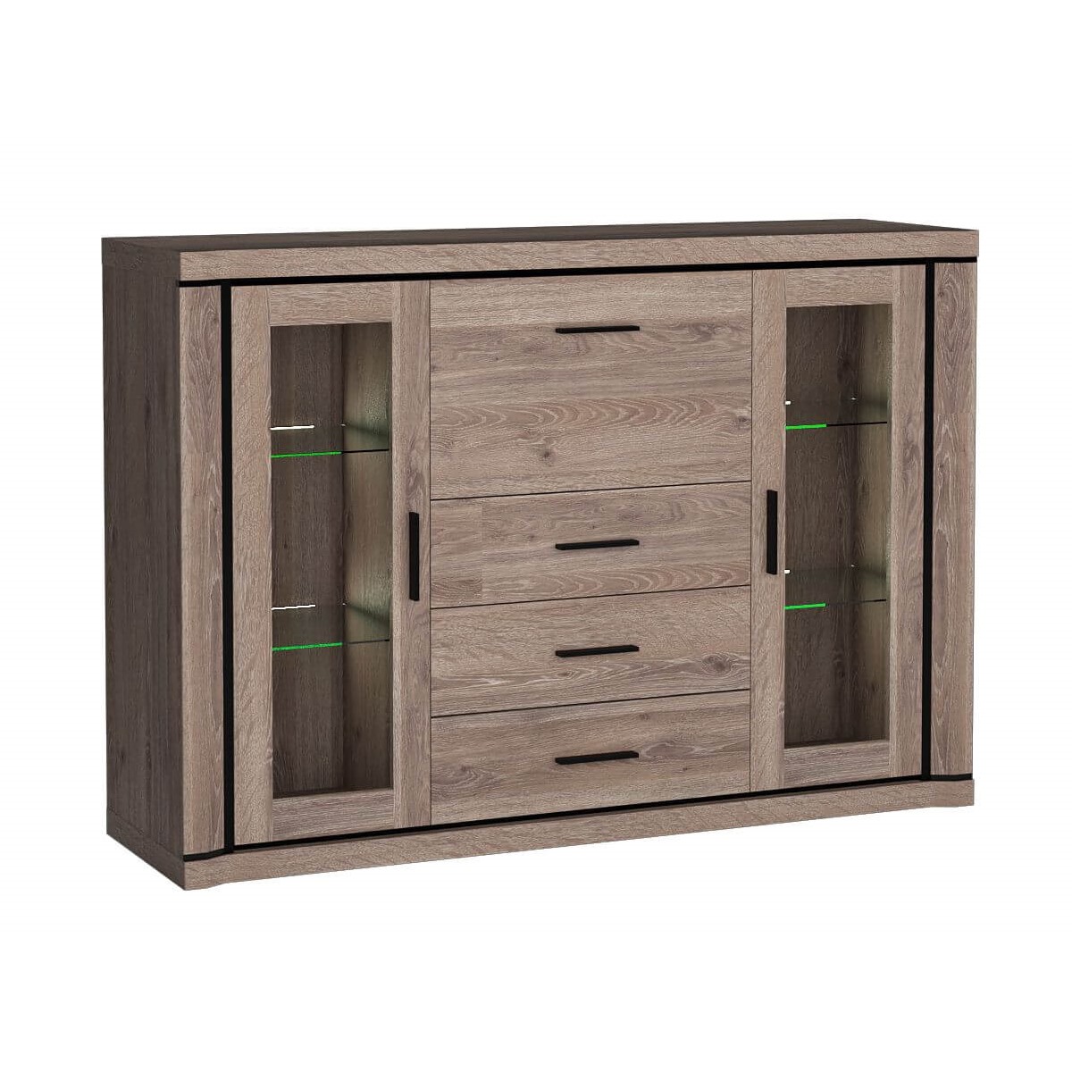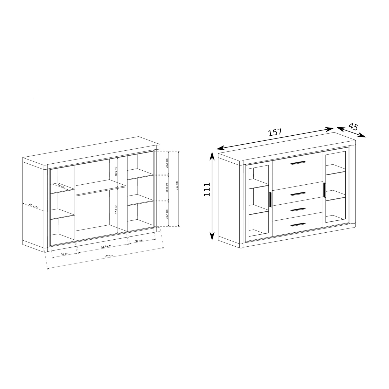 Моделът разполага с три просторни чекмеджета, бар със спускаща се надолу врата и две шкафчета със стъклени витрини и стъклени рафтове, идеални за декорации.