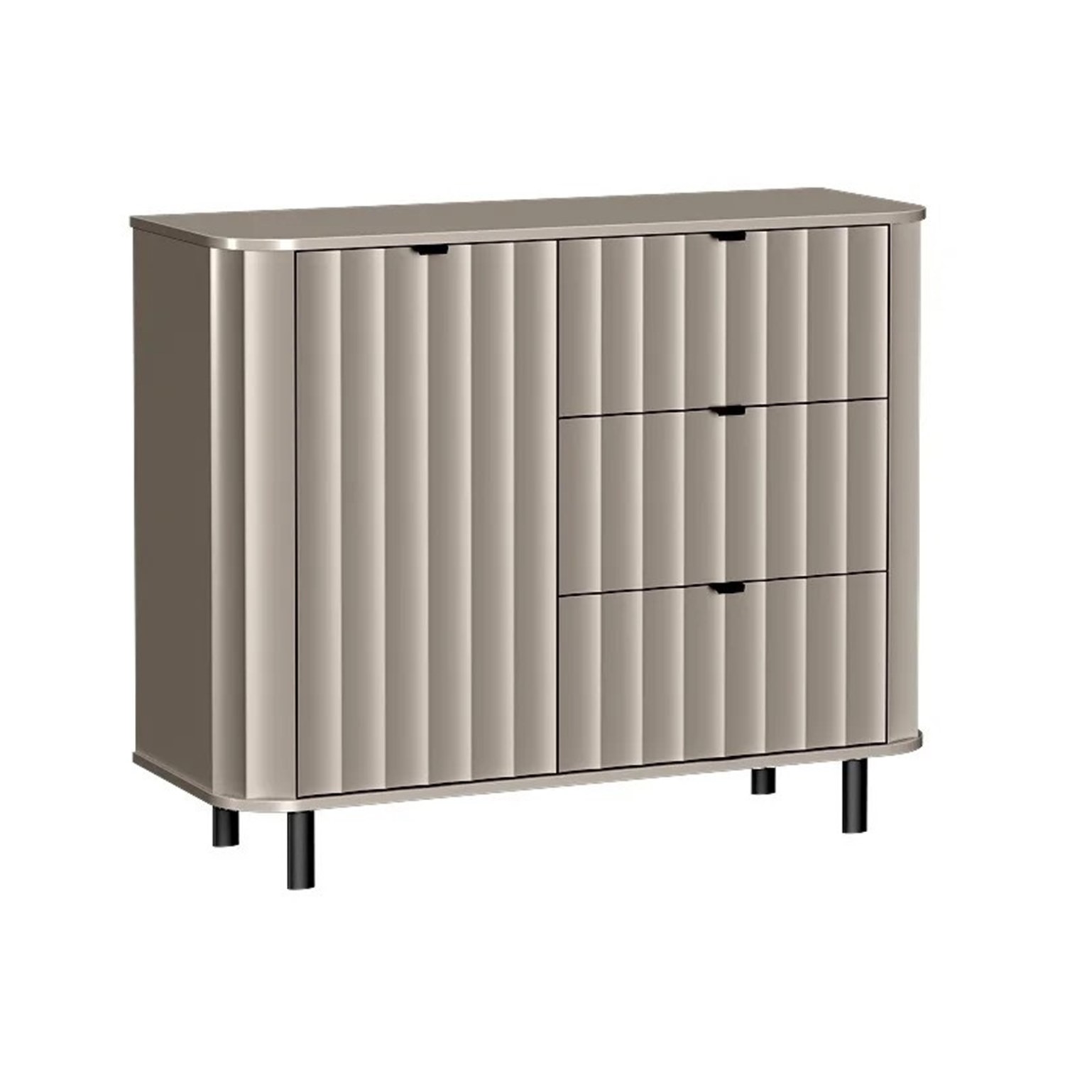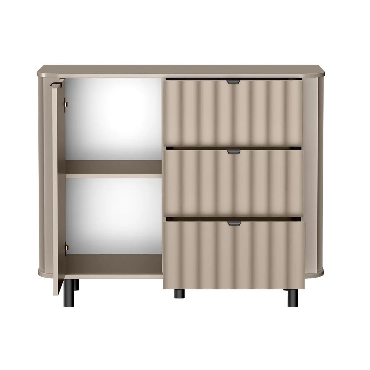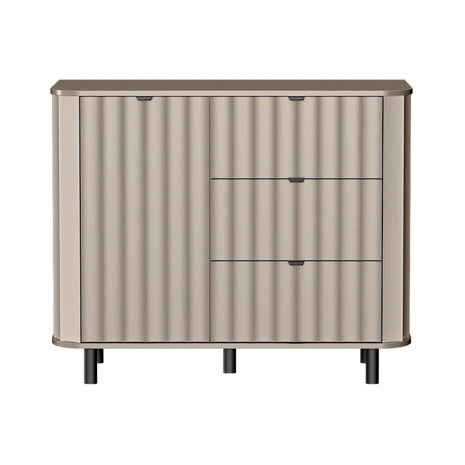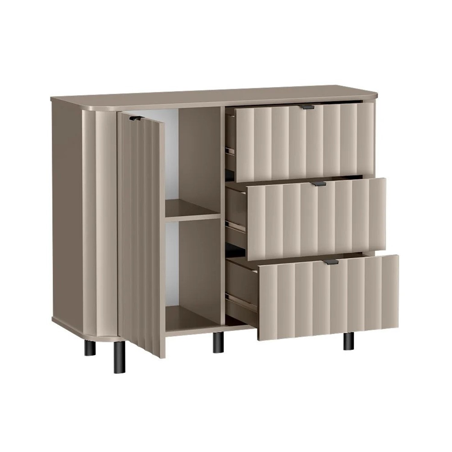 Фрезованите MDF фронтове, заоблените плотове и черните метални крака и дръжки придават на скрина изискан и модерен характер.