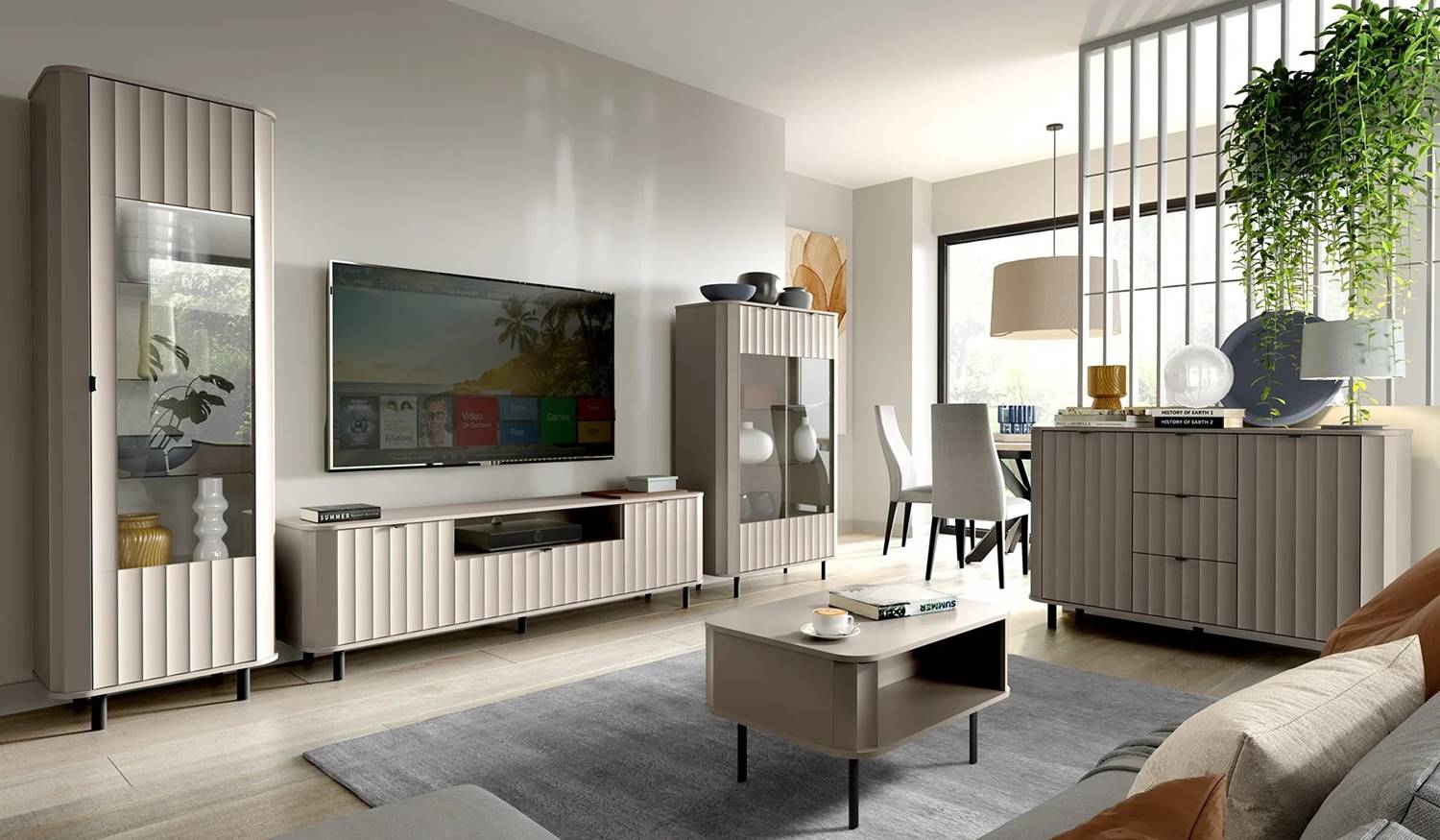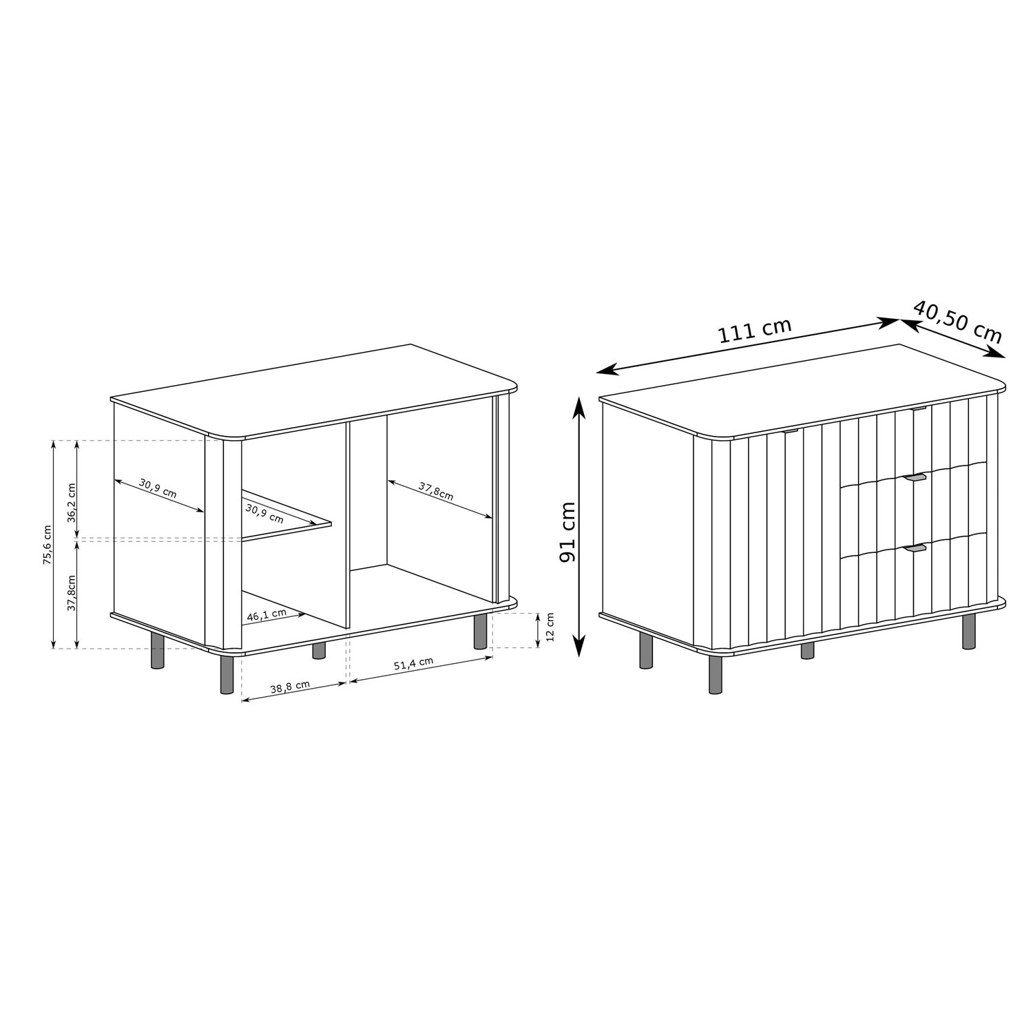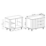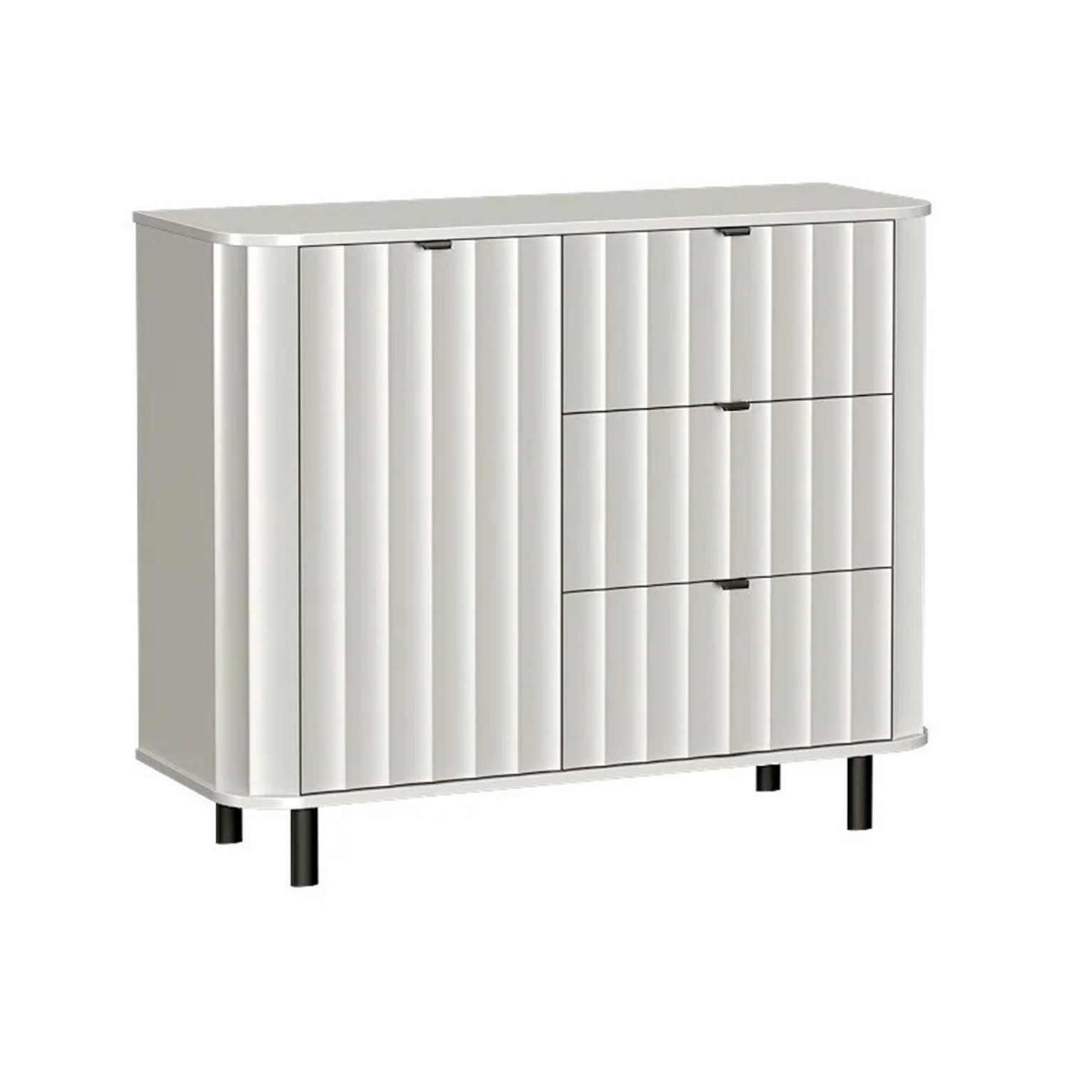 Фрезованите MDF фронтове, заоблените плотове и черните метални крака и дръжки придават на скрина изискан и модерен характер.