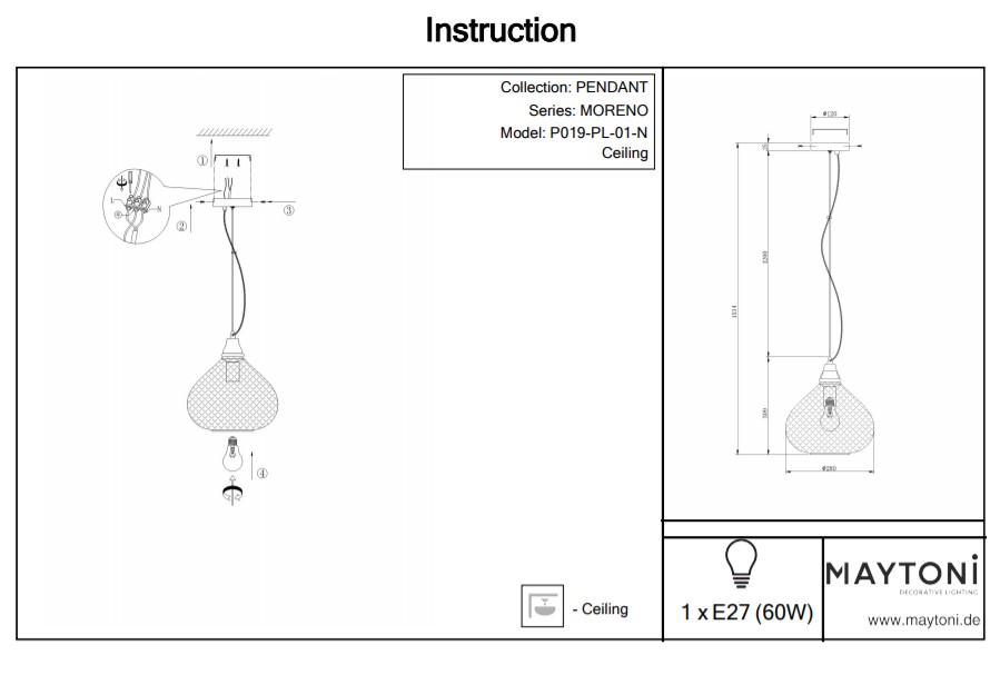 Вариант 2: диаметър – 28 см, височина – 38-153,4 см, основа – ∅ 12 х 2,5 см, наличен кабел – 120 см - Мощност: 1 х 60W
