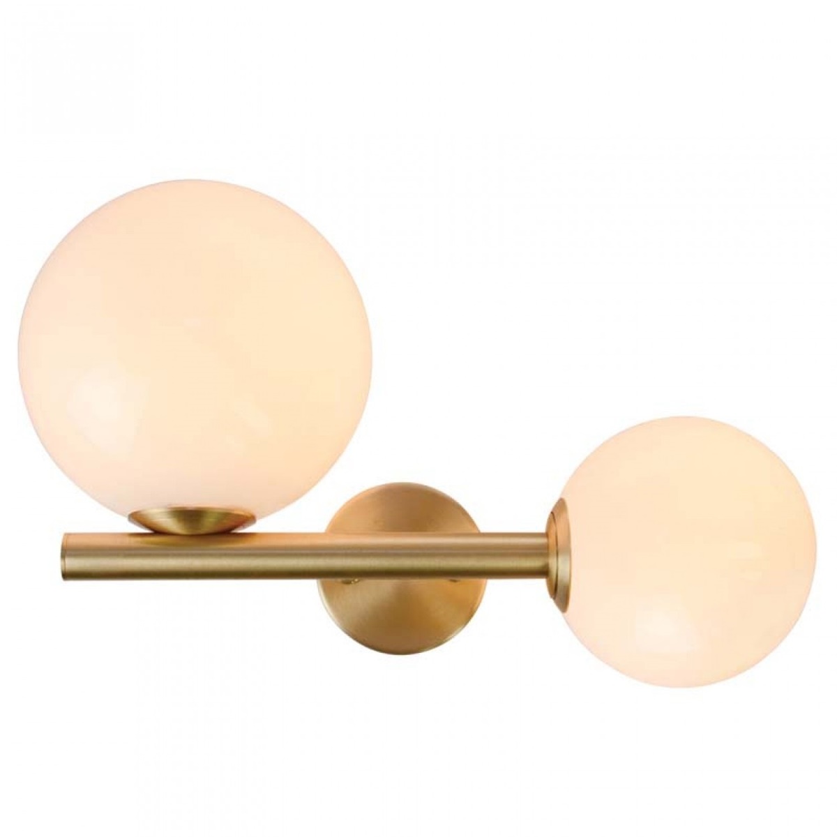 Модерен и стилен стенен аплик с метална златиста основа и две опалови стъклени сфери, които осигуряват топла и равномерна светлина.