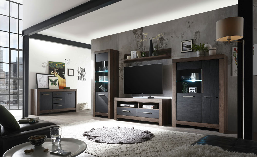BRW предлага разнообразие от модулни системи за цялостно обзавеждане на дневна, трапезария, спалня и детска стая. Продуктовата гама включва легла, гардероби, шкафове, скринове, комоди, маси, столове, ТВ поставки, етажерки, витрини, бюра, тоалетки, портманта, закачалки, огледала и други. Корпусните мебели са решени в атрактивни дървесни нюанси или с покритие от бял гланц или мат.Шкаф с 2 чекмеджета и 3 вратички Балин (2 цвята)