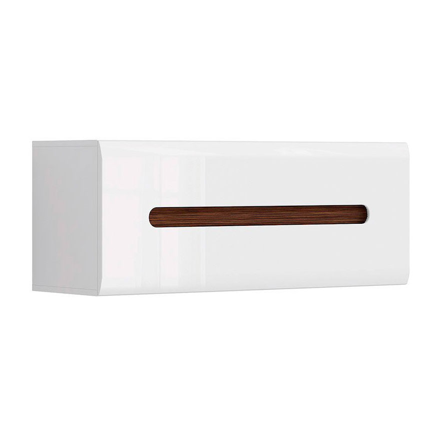 Стенен шкаф с повдигаща се вратичка с декоративна лента, изработен от ПДЧ и МДФ, модулна система Ацтека. Лентите за декорация са две – двустранна (бял или черен гланц) и едностранна в цвят венге.