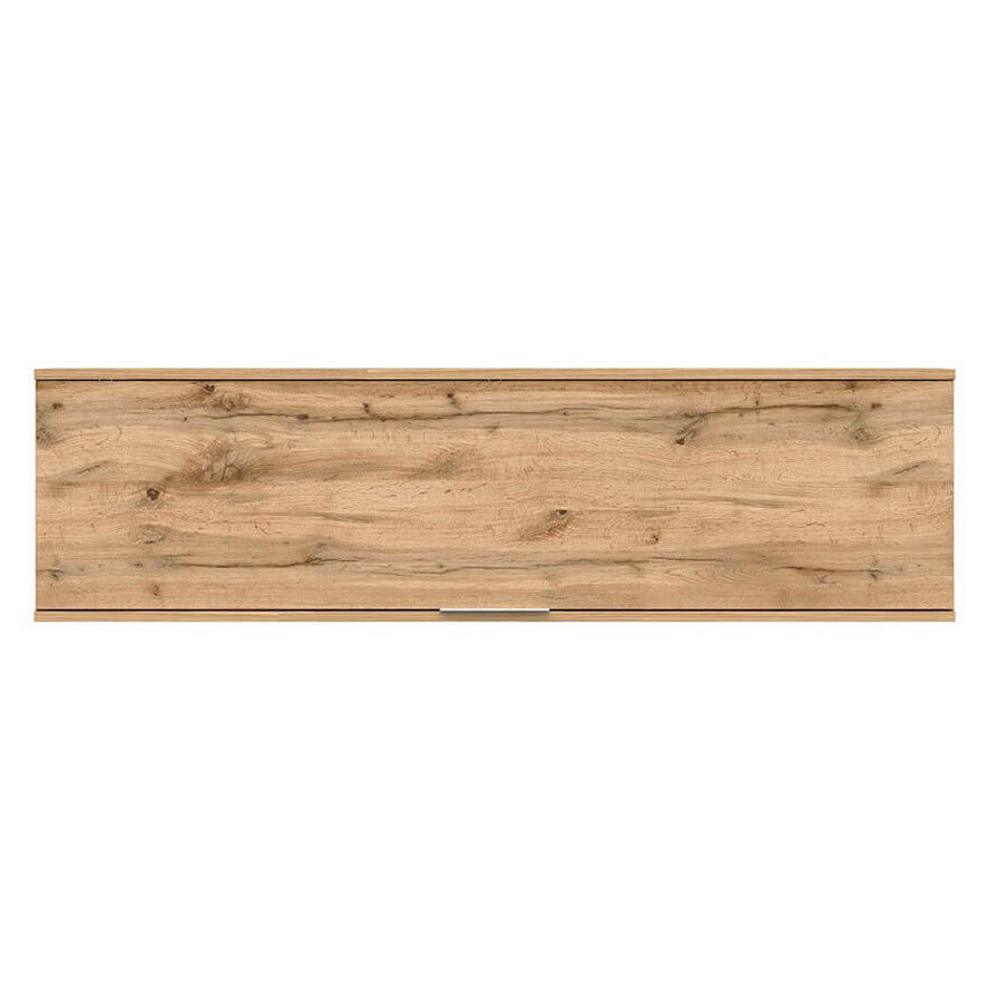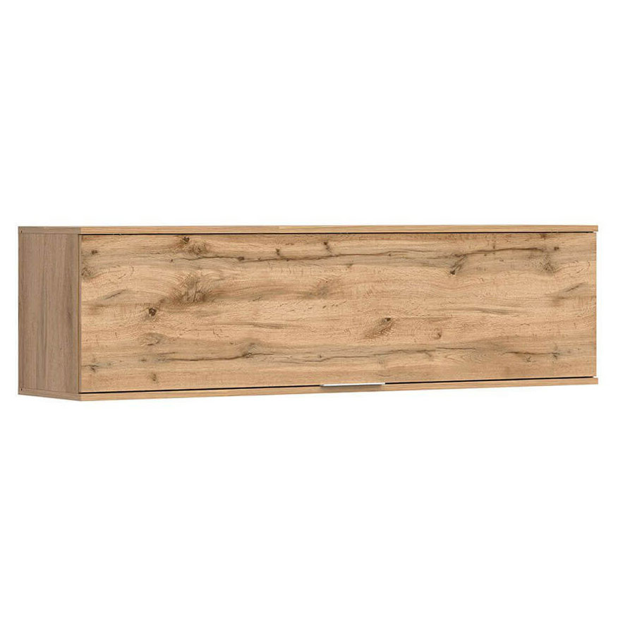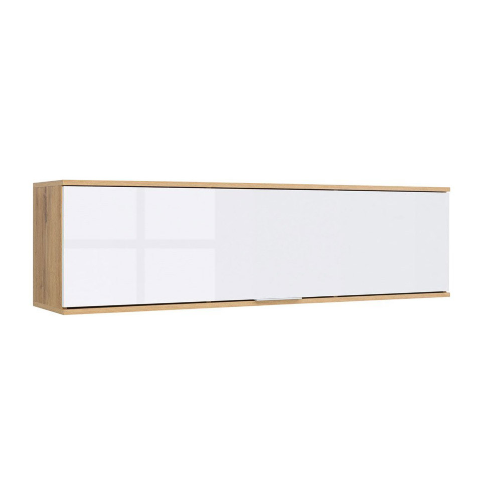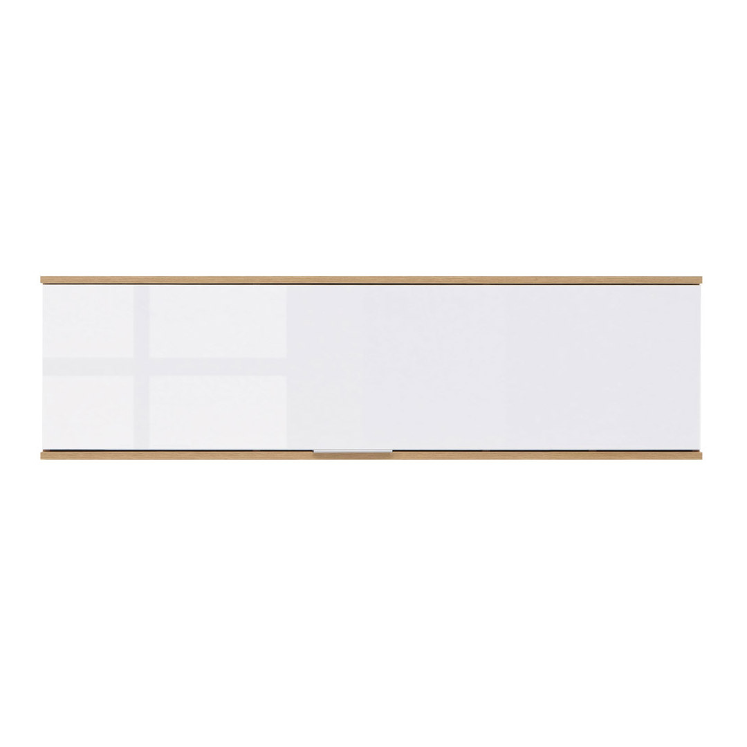 Стенен шкаф, изработен от ПДЧ с бяла лакирана вратичка, отваряща се с деликатна дръжка и корпус в цвят дъб вотан, модулна система Зелле.