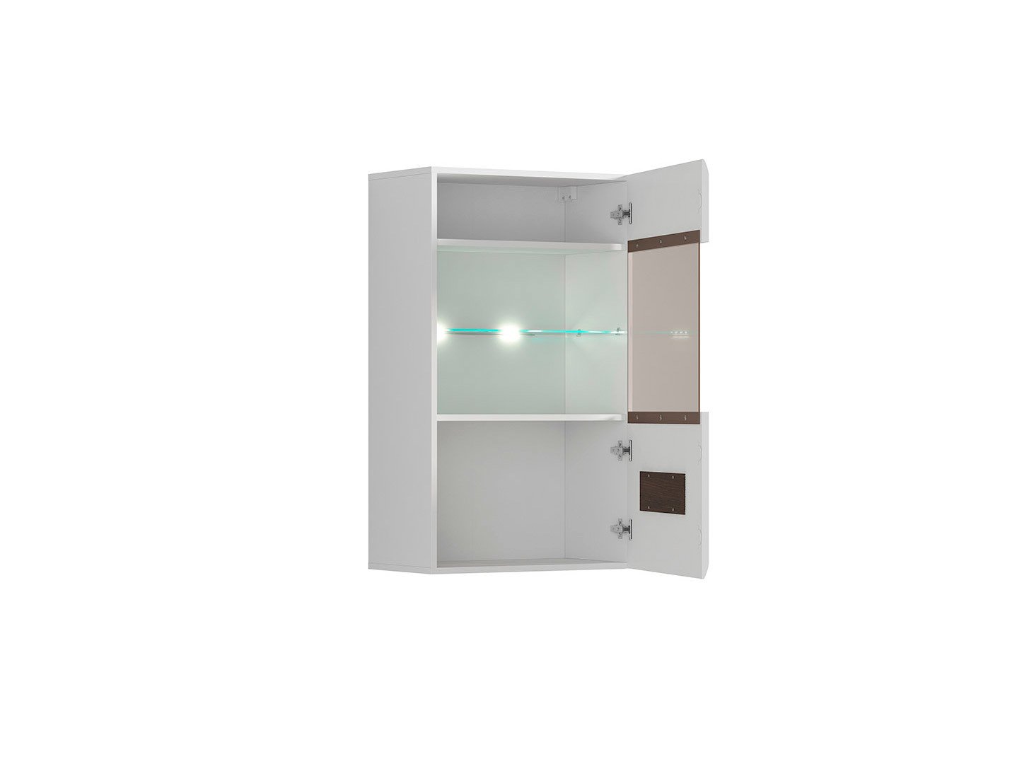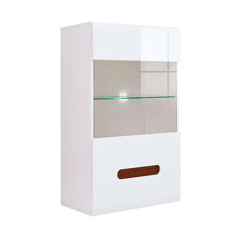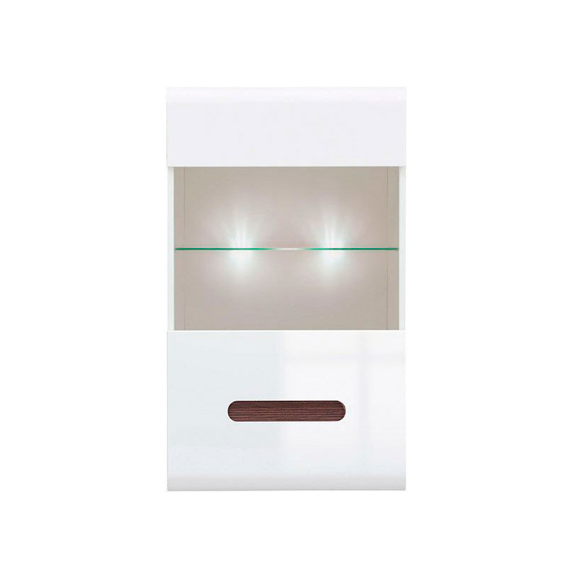 Стенен шкаф от ПДЧ и МДФ със стъклена витрина и LED осветление, модулна система Ацтека. Предлага се с две декоративни ленти – двустранна (бял или черен гланц) и едностранна в цвят венге.