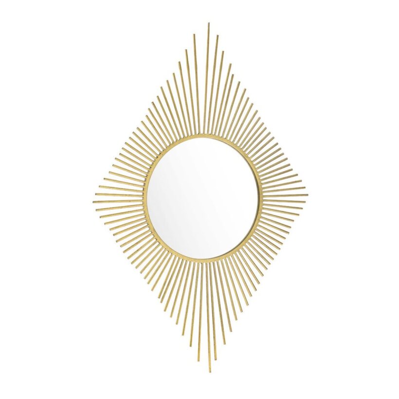 Кръгло стенно огледало с атрактивна метална рамка, наподобяваща слънчеви лъчи в златист цвят.