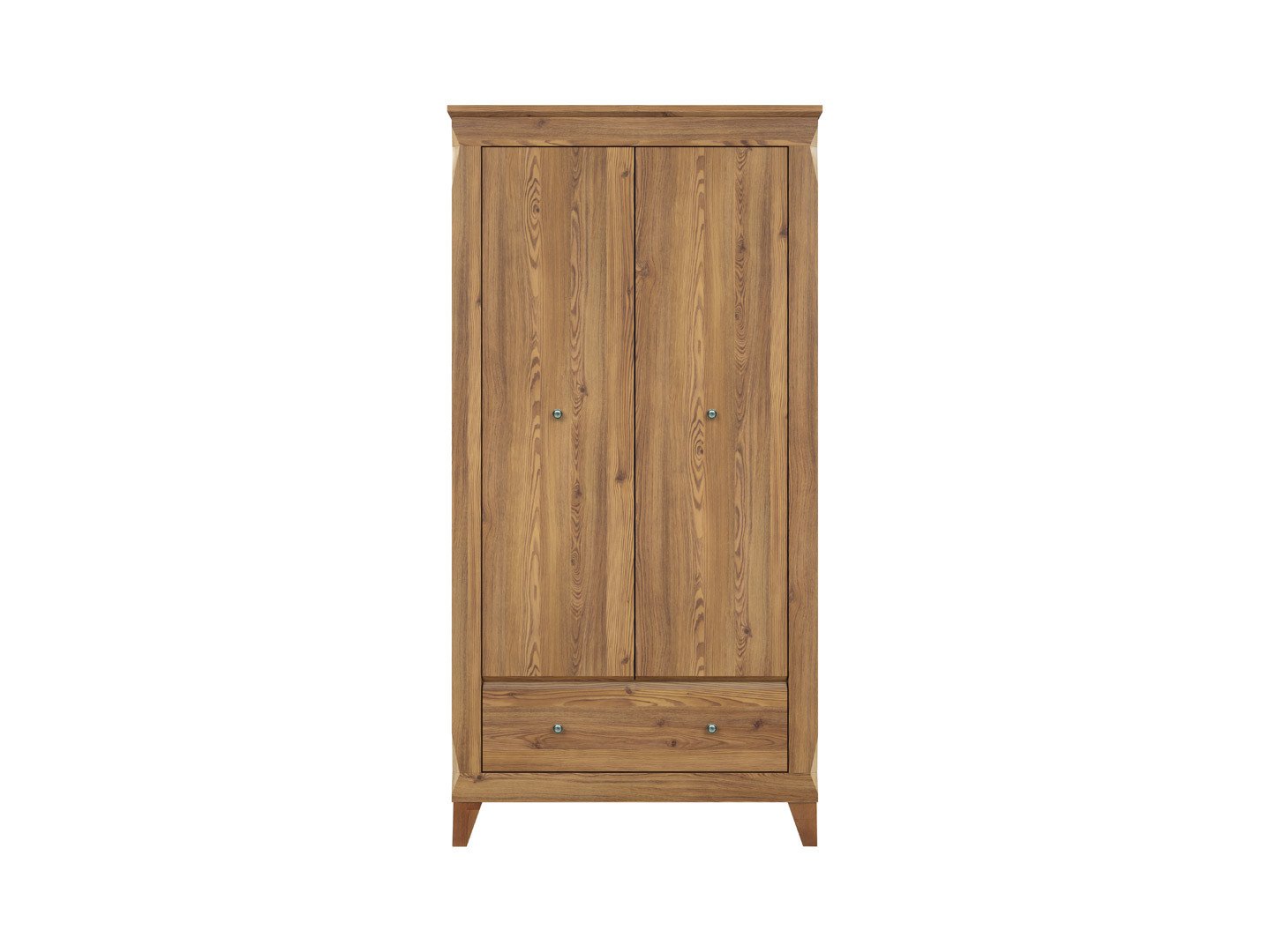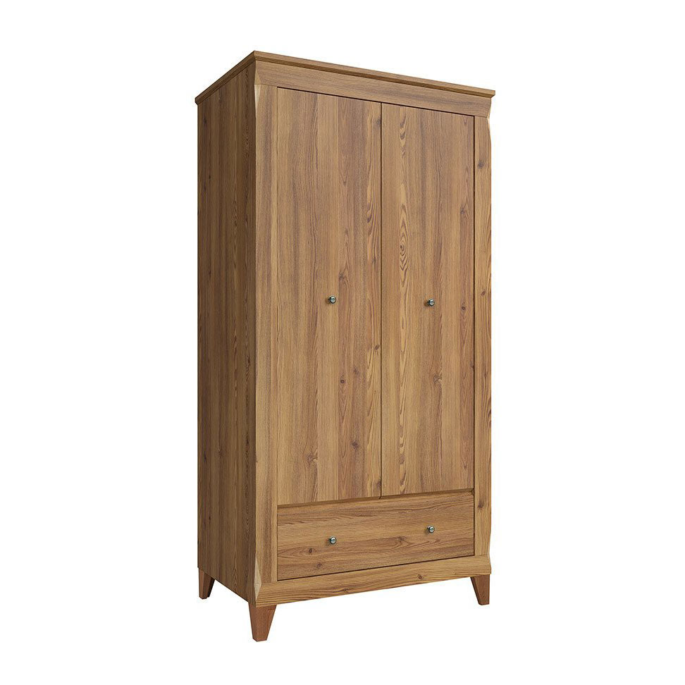 Стилен двукрилен гардероб с чекмедже, изработен от ПДЧ и МДФ в цвят златна лиственица, допълнен с дръжки тип копче, модулна система Берген.