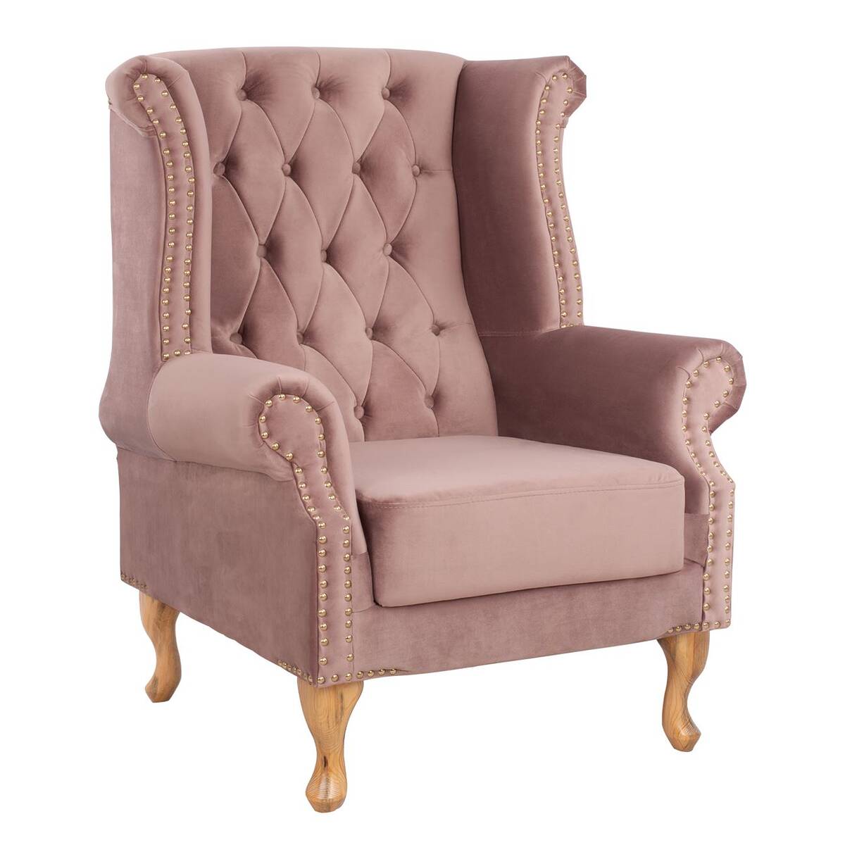 Стилен фотьойл с дамаска от кадифе, подлакътници и дървени крачета, който се предлага с тапицерия в два различни нюанса – сив и розов.