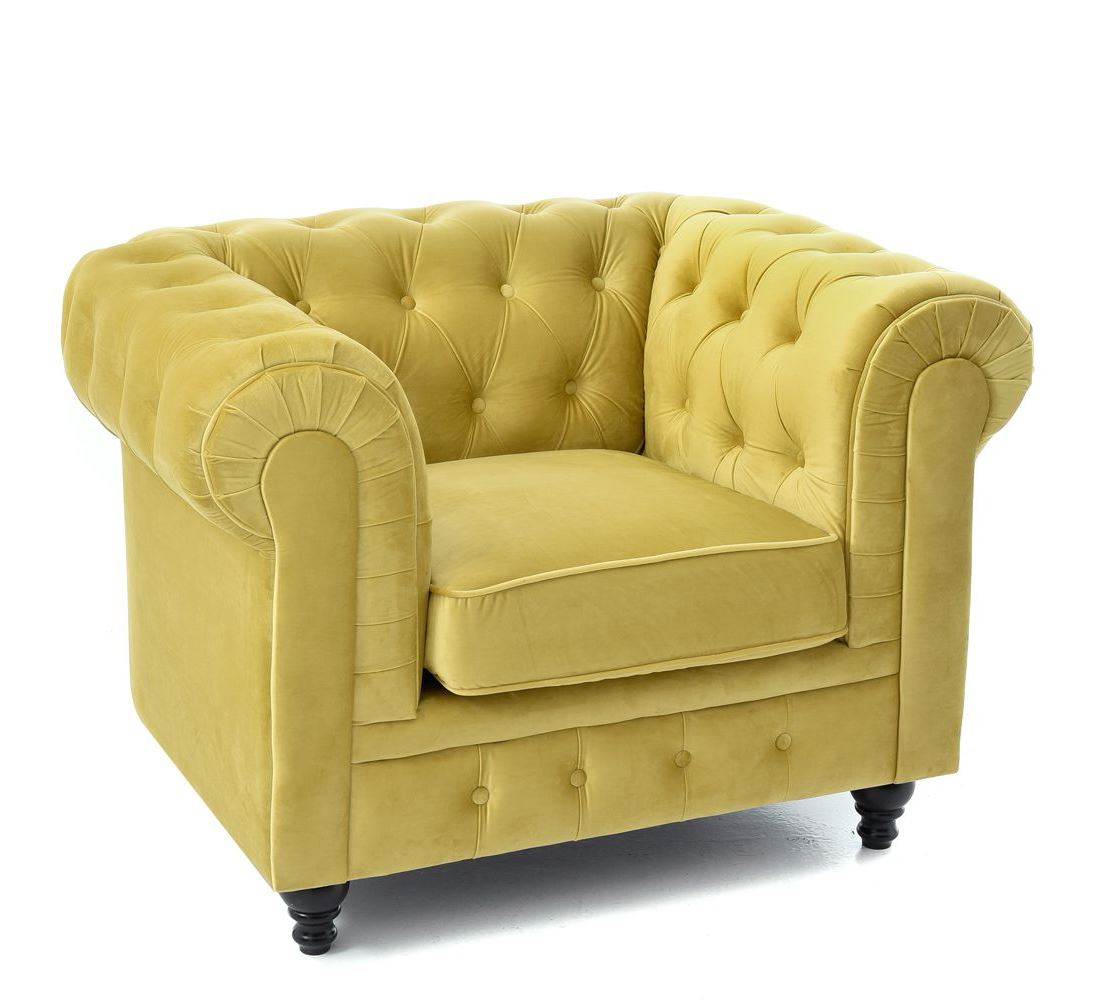 Стилен фотьойл тип Честърфийлд, изработен с капитонирана кадифена дамаска в жълто и извити дървени крачета в черен цвят.
