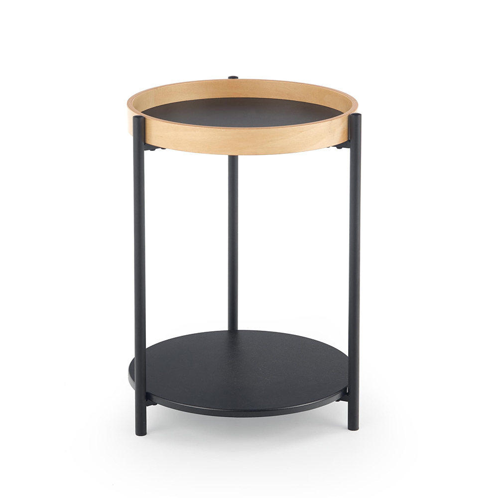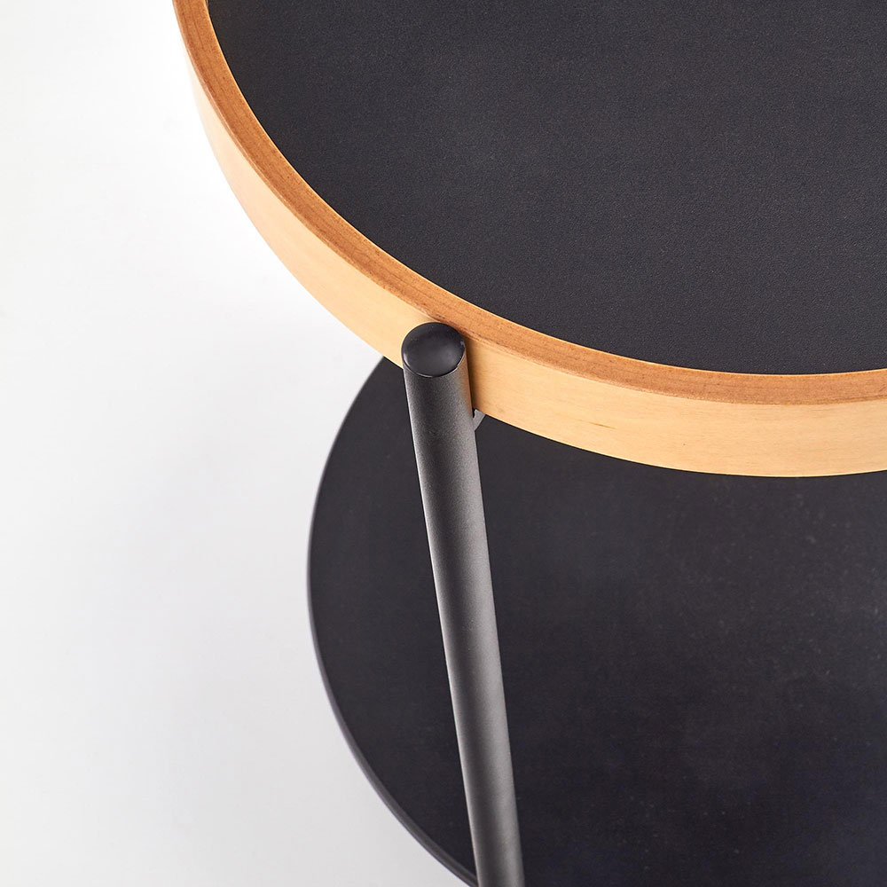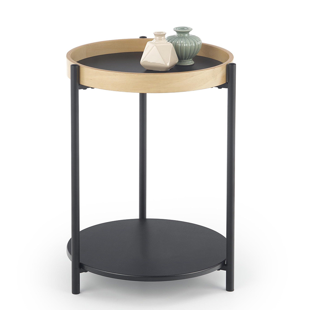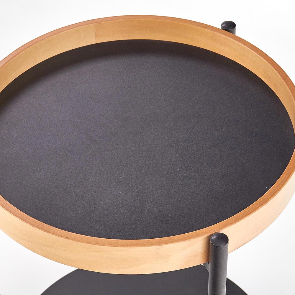 Стилна помощна маса за всекидневна с два различни кръгли плота от дърво и метал.