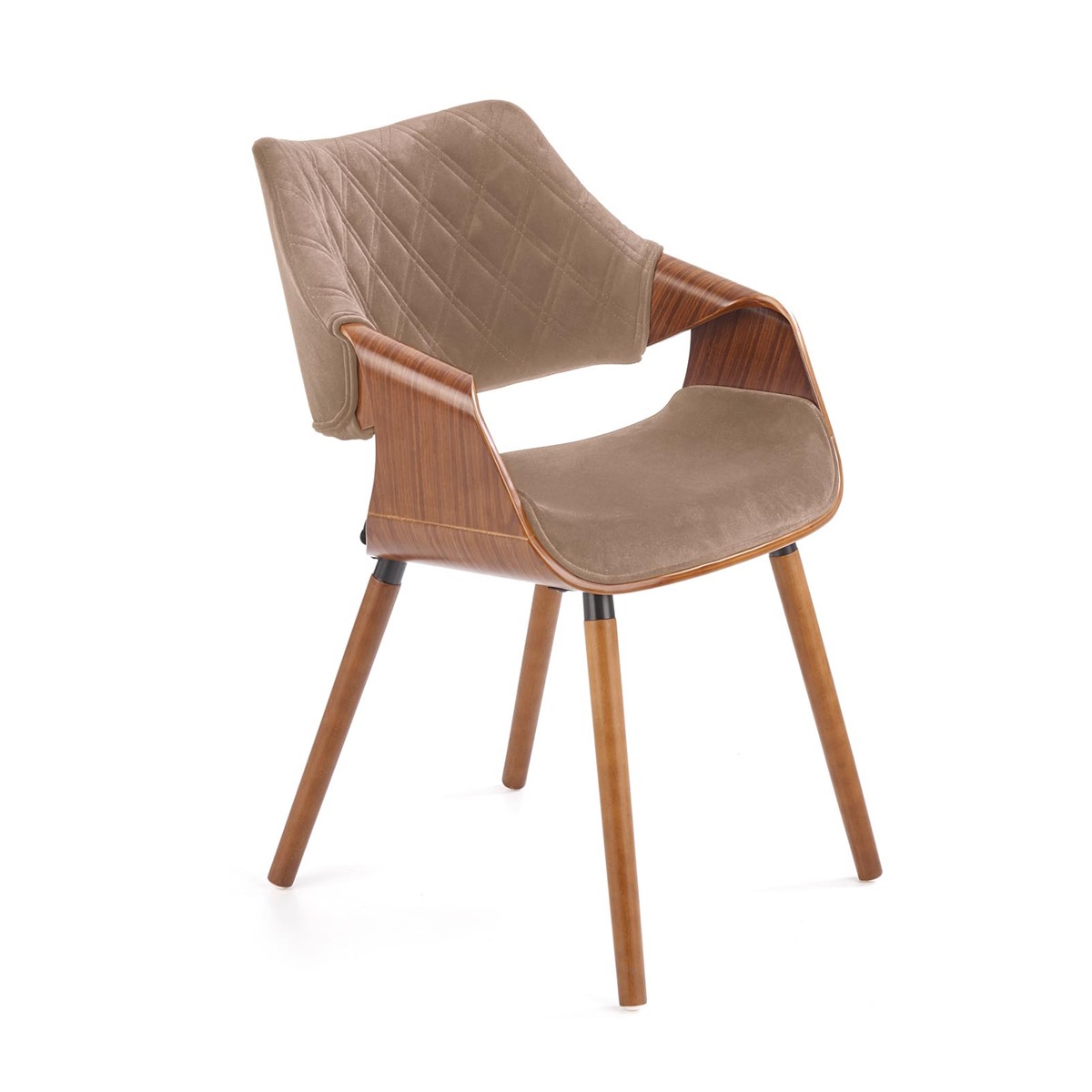 Изработен е от дърво и текстил с изрязан гръб и извити подлакътници.