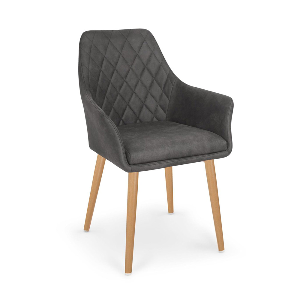 Мек и удобен стол с подлакътници от еко кожа с метални крака, боядисани в цвят естествено дърво, който би стоял чудесно във всекидневна, трапезария, фоайе или офис приемна.