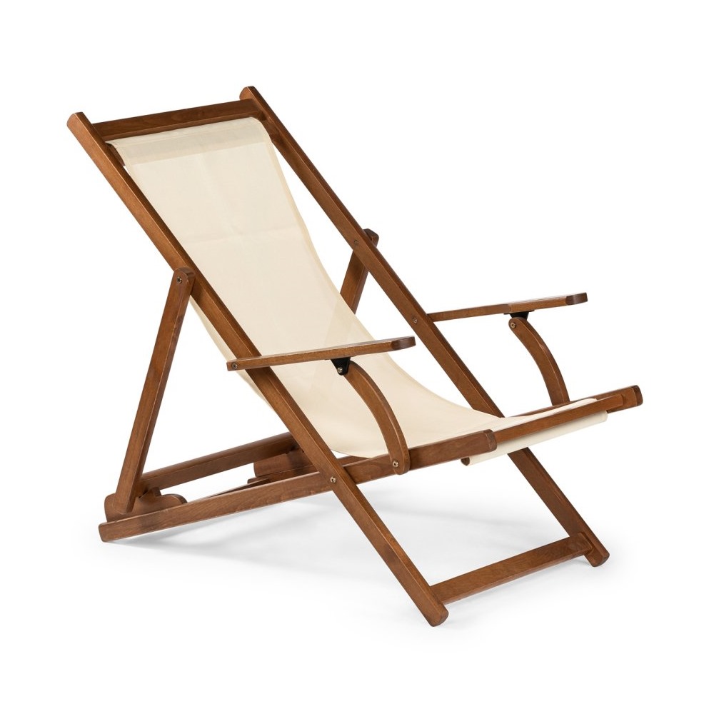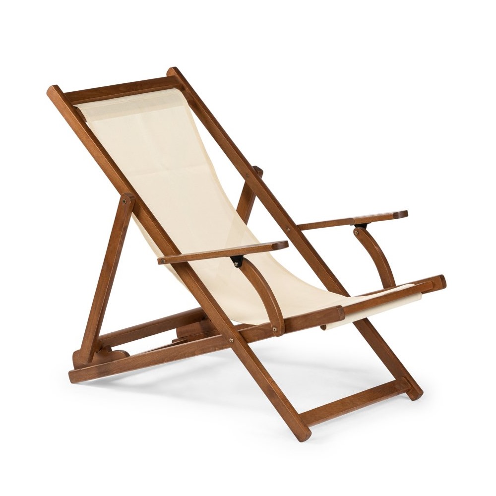 Практичен стол-шезлонг с подлакътници, изработен от масивно буково дърво и платнена или PVC (водоустойчива) седалка в светъл тон.