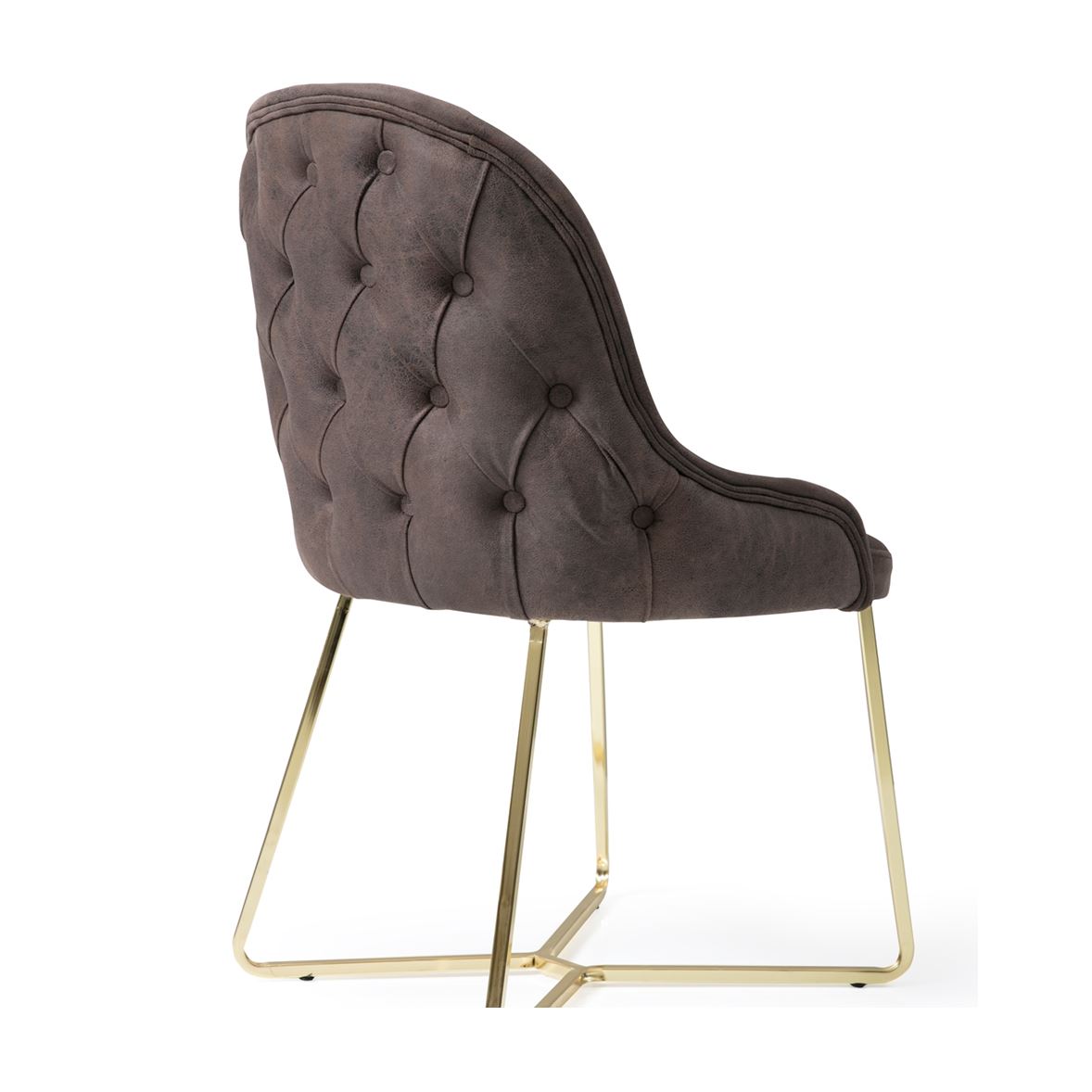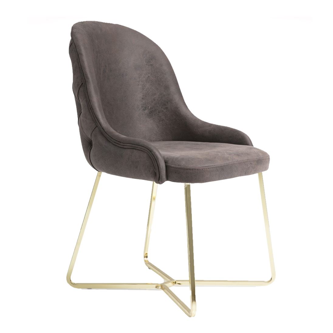 Красив трапезен стол, изработен с нестандартна метална основа в златисто и тапицерия в сив цвят.