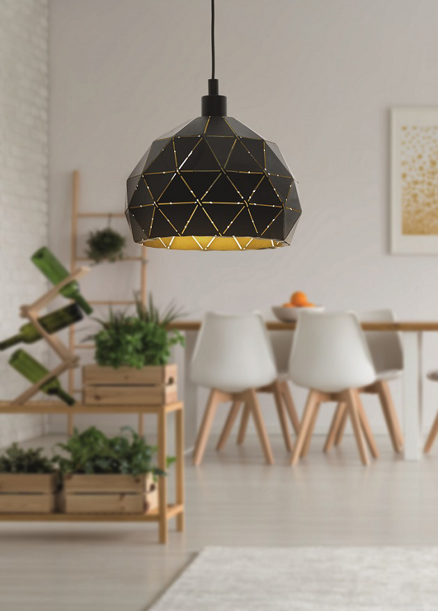 Красив стоманен пендел с неравна повърхност в черно и златно Eglo серия Roccaforte в два размера.