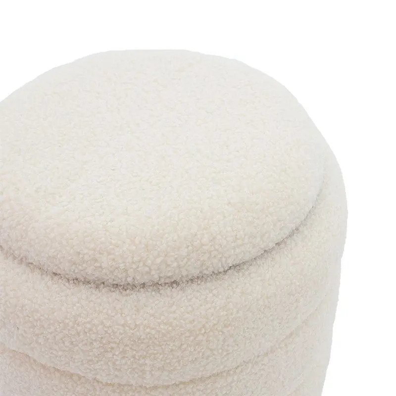 Табуретка с място за съхранение в актуалната дамаска от букле в цвят крем и кръгла златиста основа.