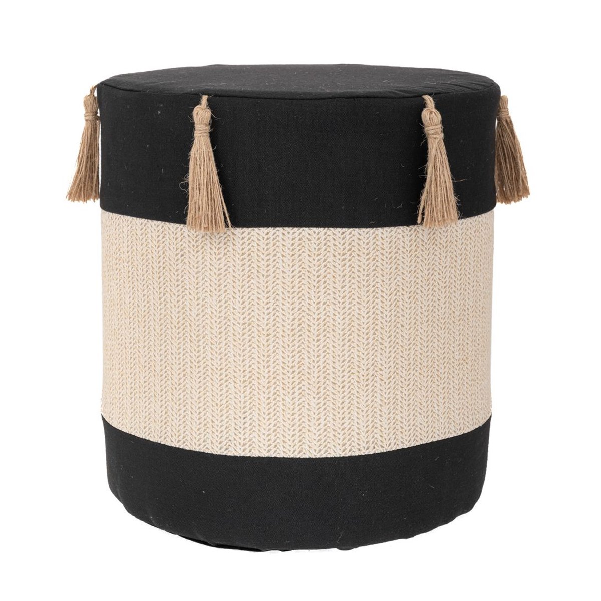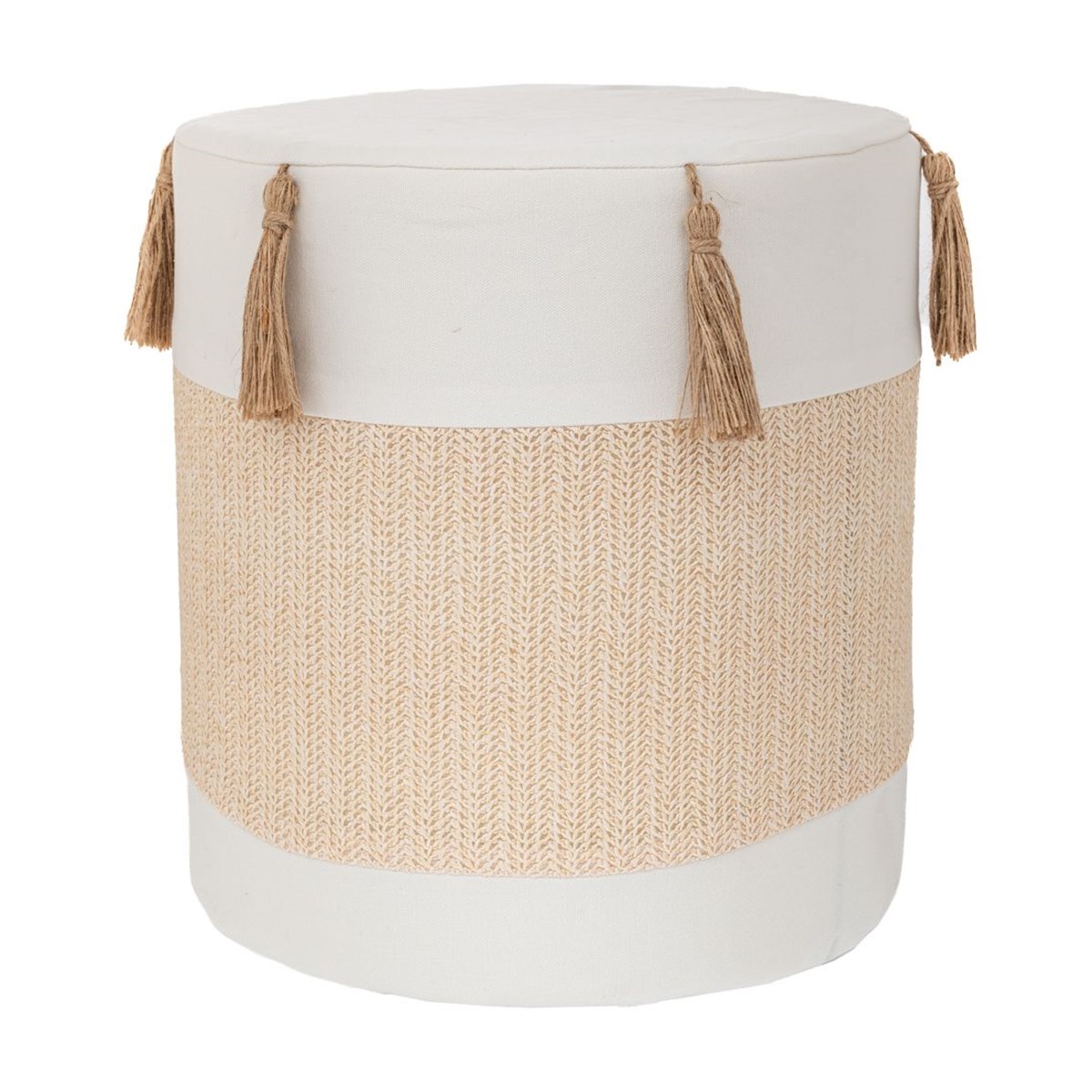 Компактната табуретка с текстилна дамаска и пискюли е мебел, която позволява да се използва и като поставка за крака или малка помощна масичка.