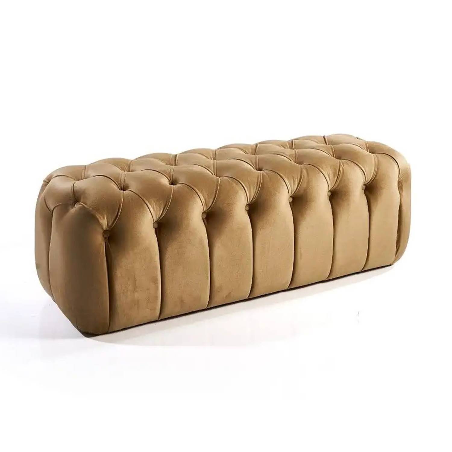 Стилна тапицирана пейка, изработена с мека на допир текстилна дамаска в светлокафяв цвят и капитонирана седалка с декоративни копчета. Предлага се в 2 размера.