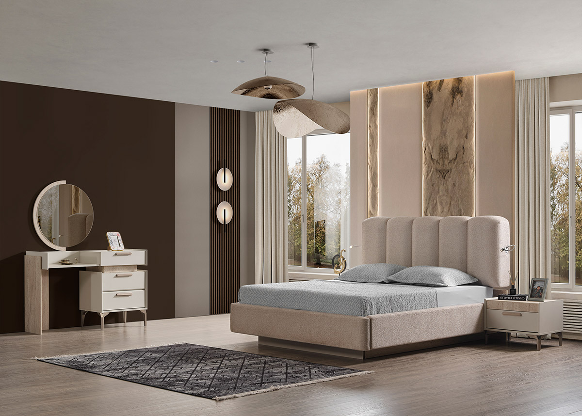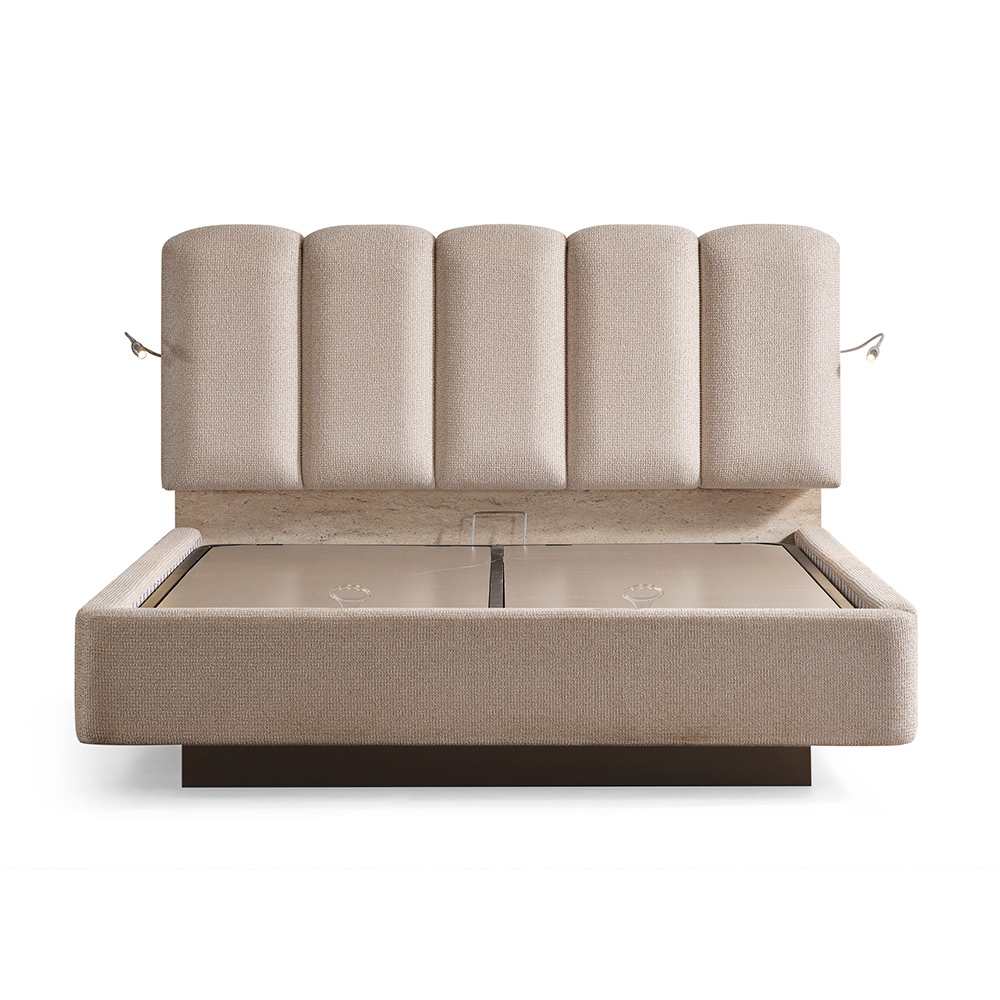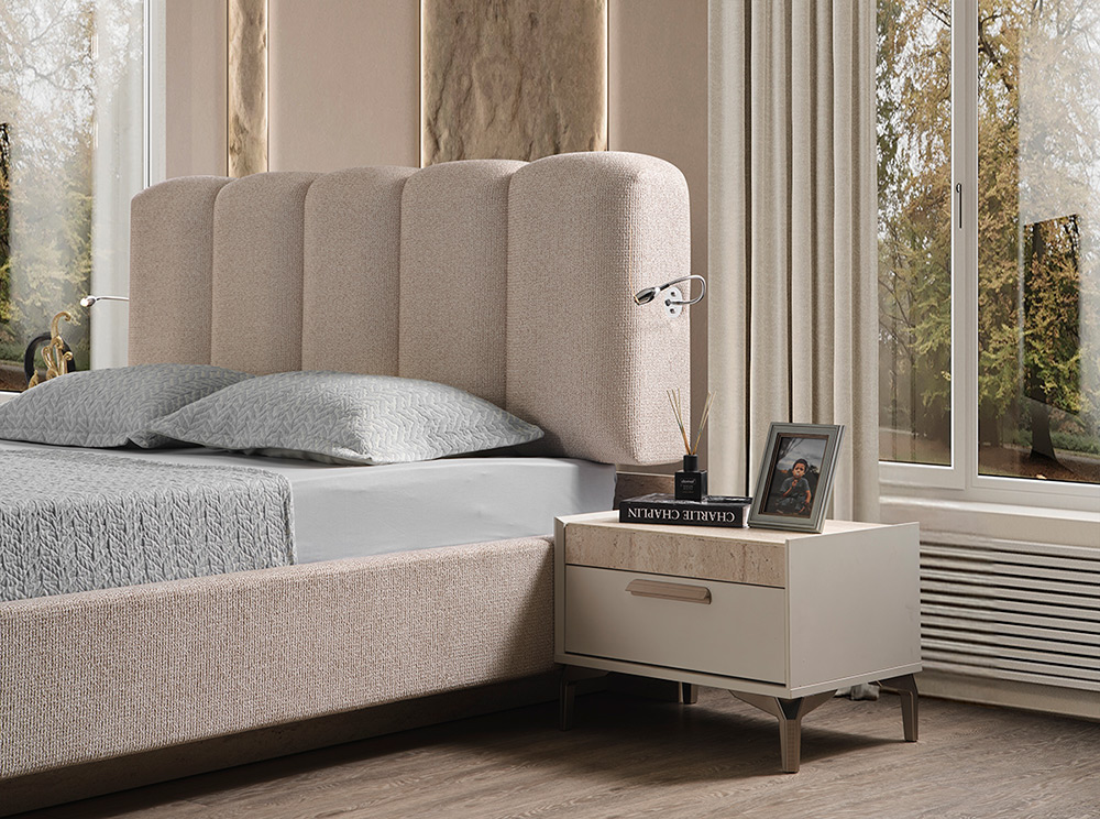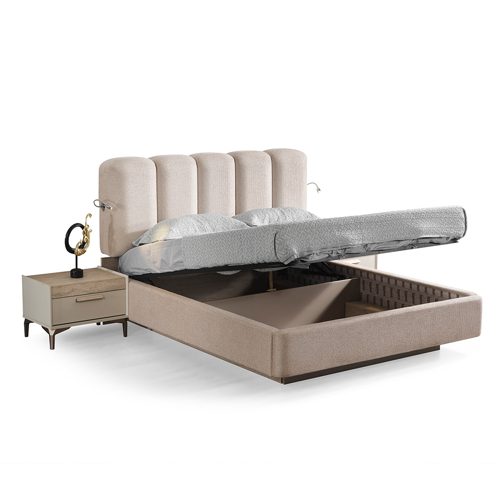 Това тапицирано легло с повдигащ механизъм и вградено осветление е част от спален комплект Varna.