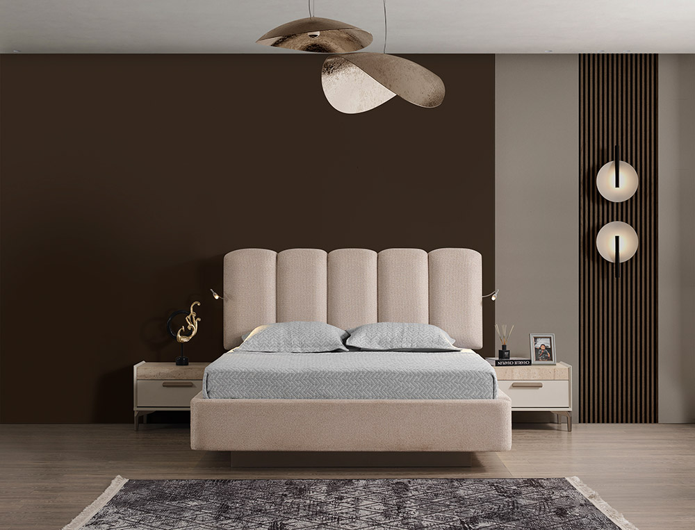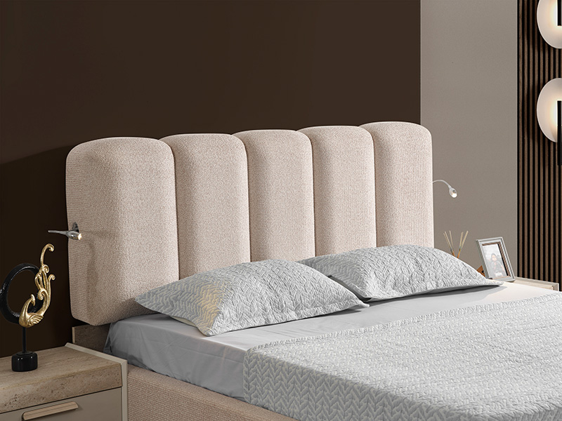 Високата табла и корпусът са с текстилна дамаска в кремав цвят.