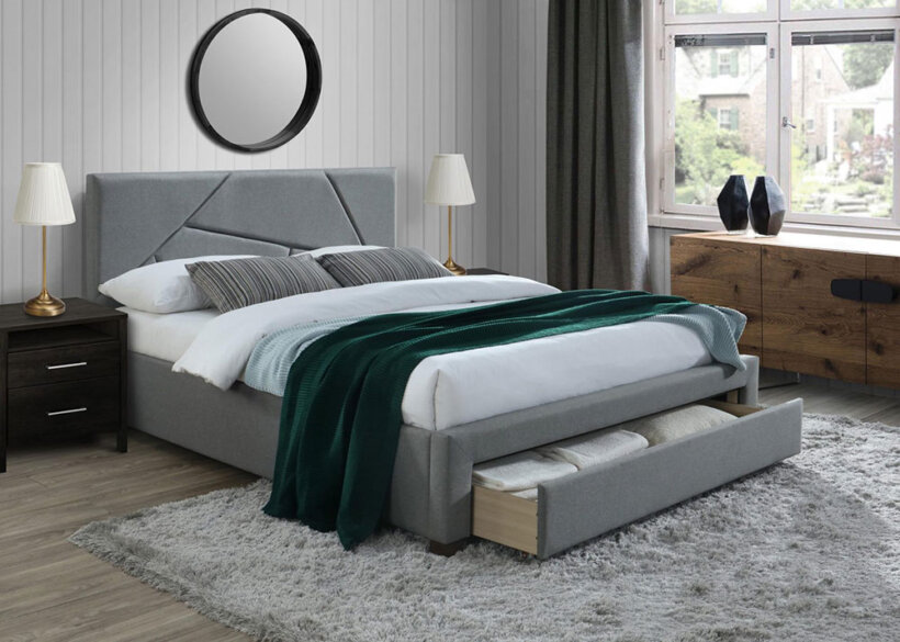 Интересният, разчупен дизайн на таблата и универсален сив цвят на леглото ще добавят акцент към всяка спалня, решена в модерен стил.