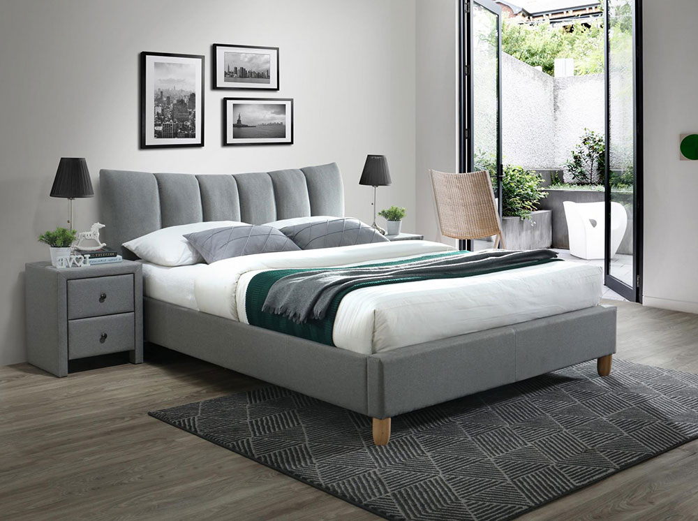 Модерно тапицирано легло с атрактивен дизайн в сив цвят на крачета, подходящо за матрак с размери 160 х 200 см.