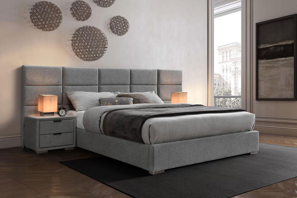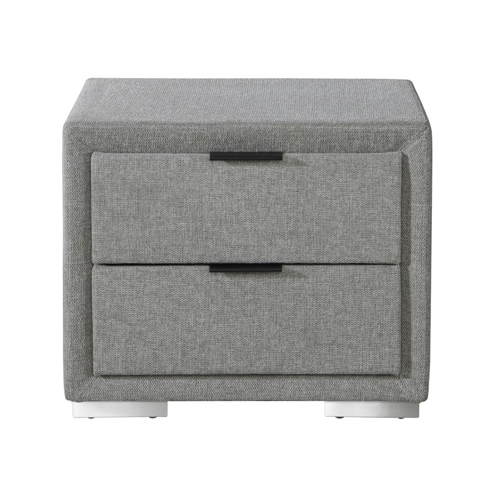 Тапицирано нощно шкафче с две чекмеджета с елегантни дръжки, покрито с текстил в сив цвят, серия Андра.